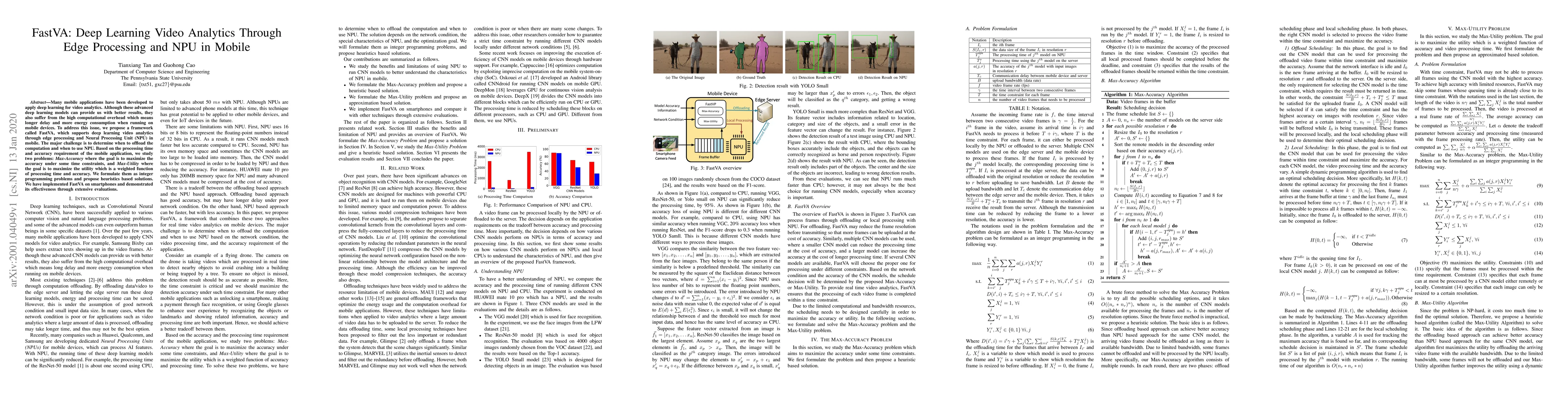 FastVA is a framework for deep learning video analytics on mobile devices using edge processing and Neural Processing Units (NPUs) to reduce computational overhead and energy consumption. It addresses the challenge of balancing computation and accuracy through heuristic solutions for Max-Accuracy and Max-Utility problems.