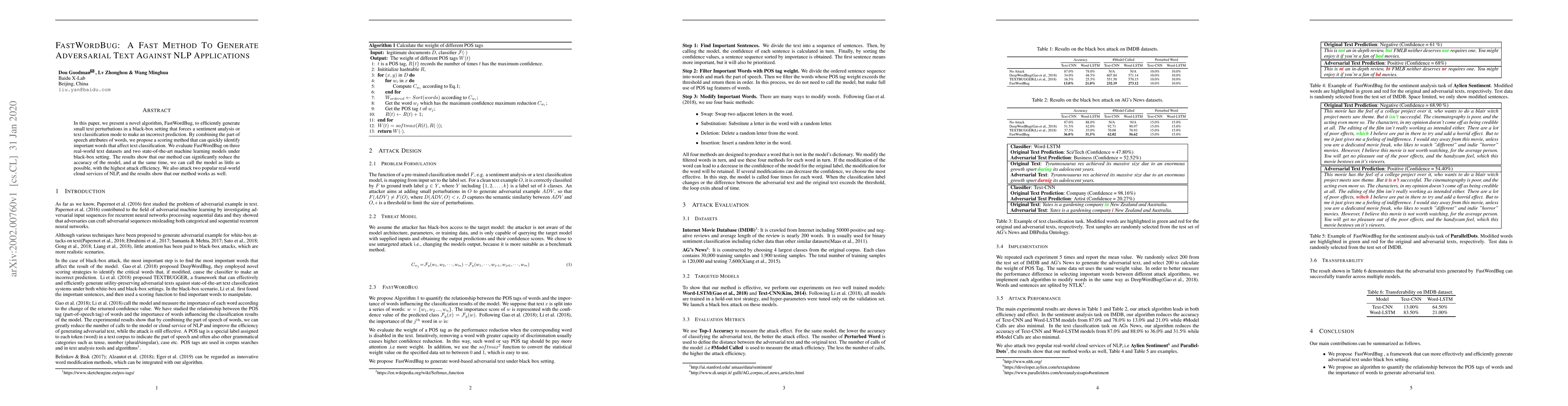 FastWordBug efficiently generates small text perturbations that deceive sentiment analysis and text classification models, reducing accuracy while minimizing attack calls.