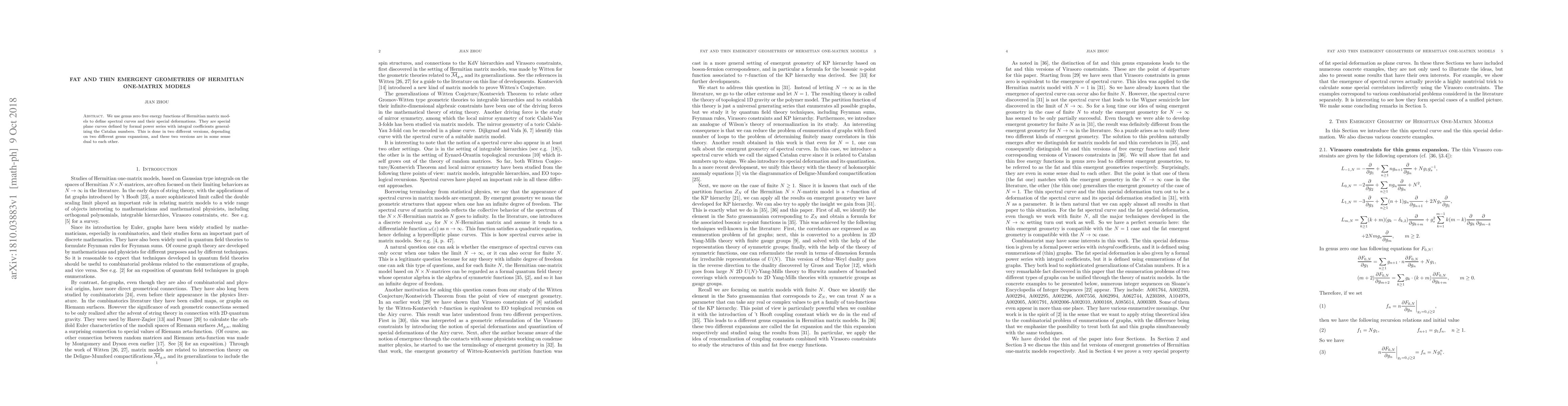 We use genus zero free energy functions of Hermitian matrix models to define spectral curves and their special deformations. They are special plane curves defined by formal power series with integral coefficients generalizing the Catalan numbers. This is done in two different versions, depending on two different genus expansions, and these two versions are in some sense dual to each other.