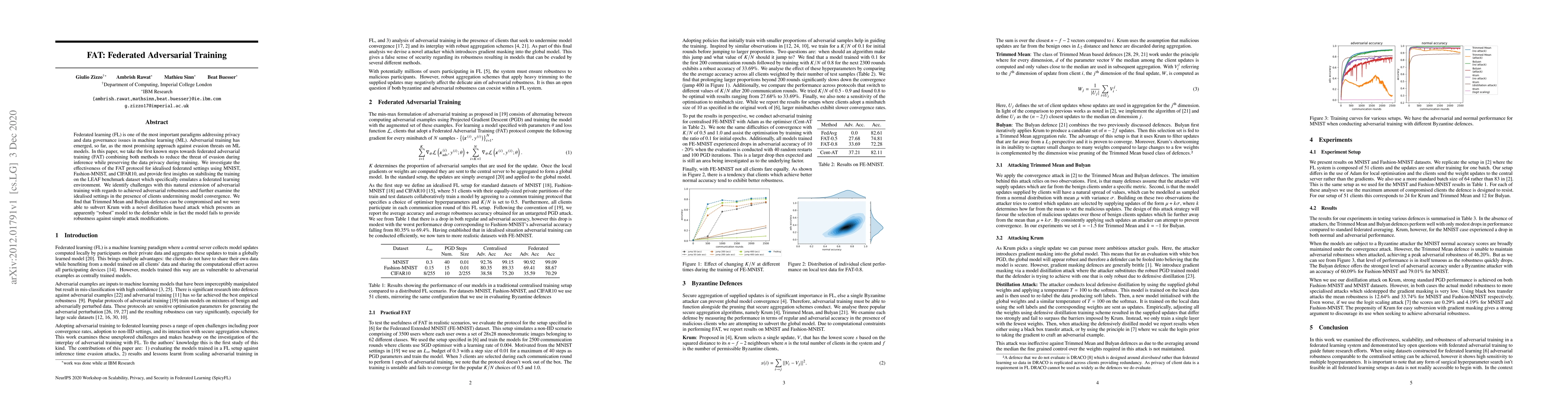 This paper introduces Federated Adversarial Training (FAT) to combine federated learning with adversarial training to enhance model robustness against evasion attacks while maintaining data privacy. Initial results on MNIST, Fashion-MNIST, and CIFAR10 show mixed success, with some defences being compromised, highlighting the challenges in achieving robust federated learning models.
