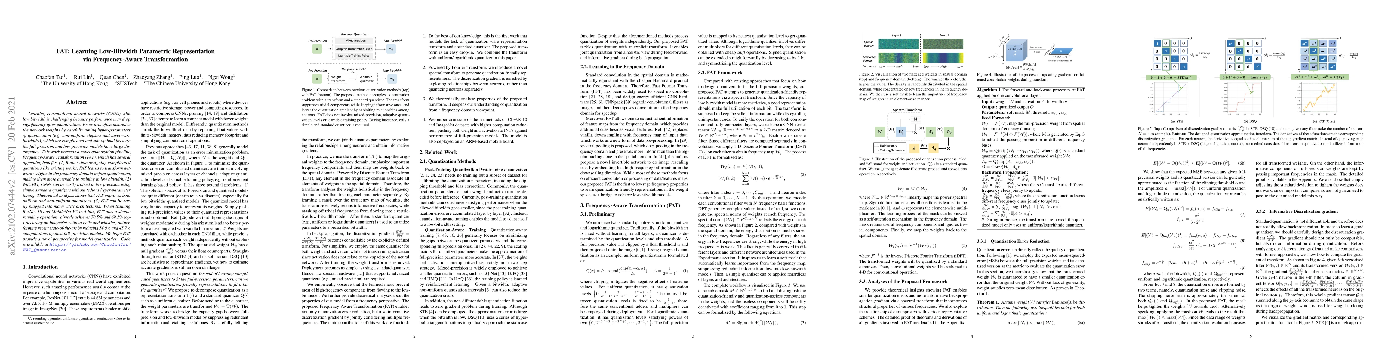 This research introduces Frequency-Aware Transformation (FAT), a novel quantization pipeline for learning convolutional neural networks (CNNs) with low bitwidths. FAT learns to transform network weights in the frequency domain, simplifying training and improving performance without complex hyper-parameter tuning. The method achieves high accuracy on ImageNet with significant computational reductions. For more details, refer to the paper and the provided code repository.