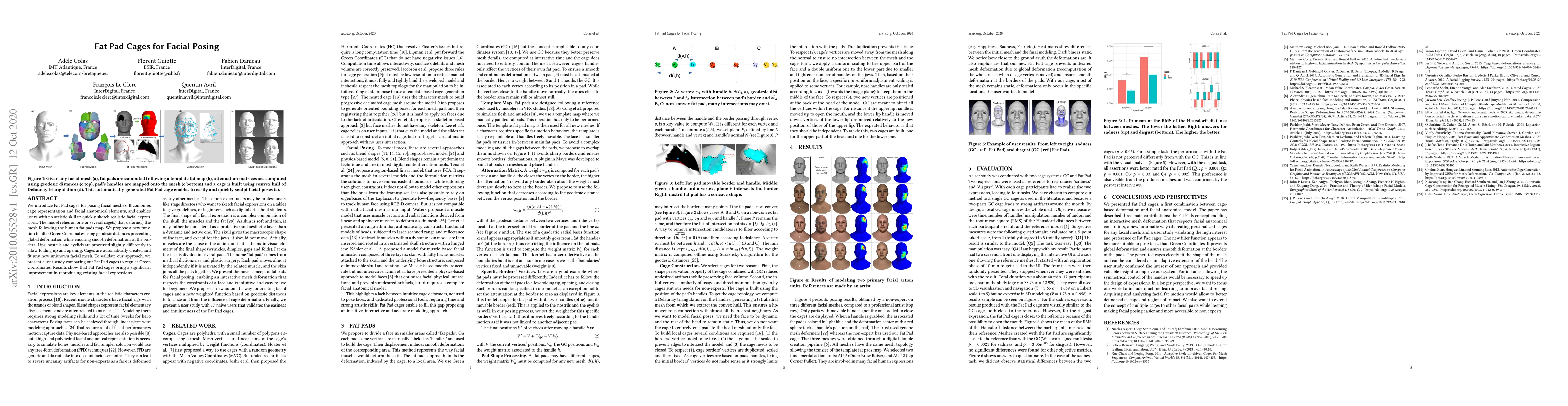 This paper introduces Fat Pad cages for facial mesh posing, combining cage representation with facial anatomical elements to enable non-artists to sketch realistic expressions. The method uses deformable cages based on human fat pads and a new filtering function to ensure smooth deformations, with special handling for lips, nostrils, and eyelids. A user study demonstrates significant improvement over regular Green Coordinates in reproducing facial expressions.