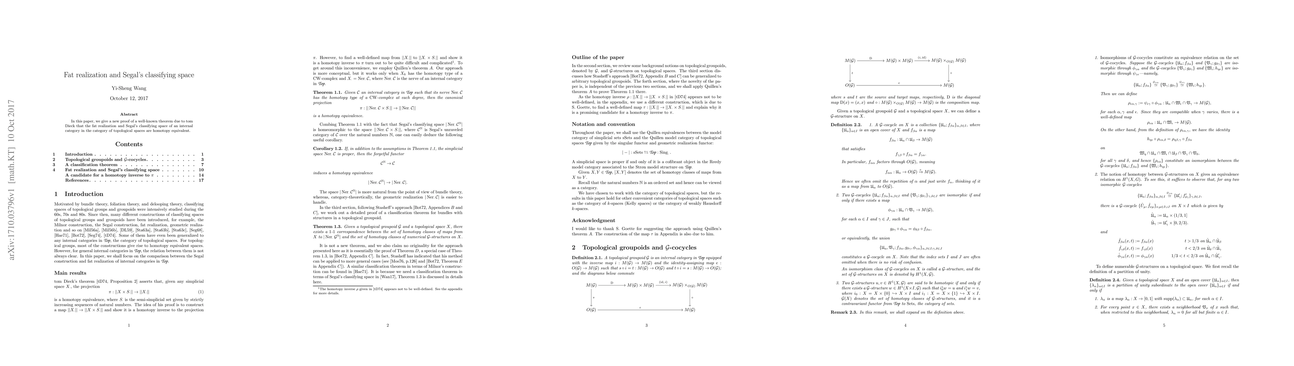 The paper provides a new proof of a well-known theorem by tom Dieck, demonstrating the homotopy equivalence between the fat realization and Segal's classifying space of an internal category in the category of topological spaces.