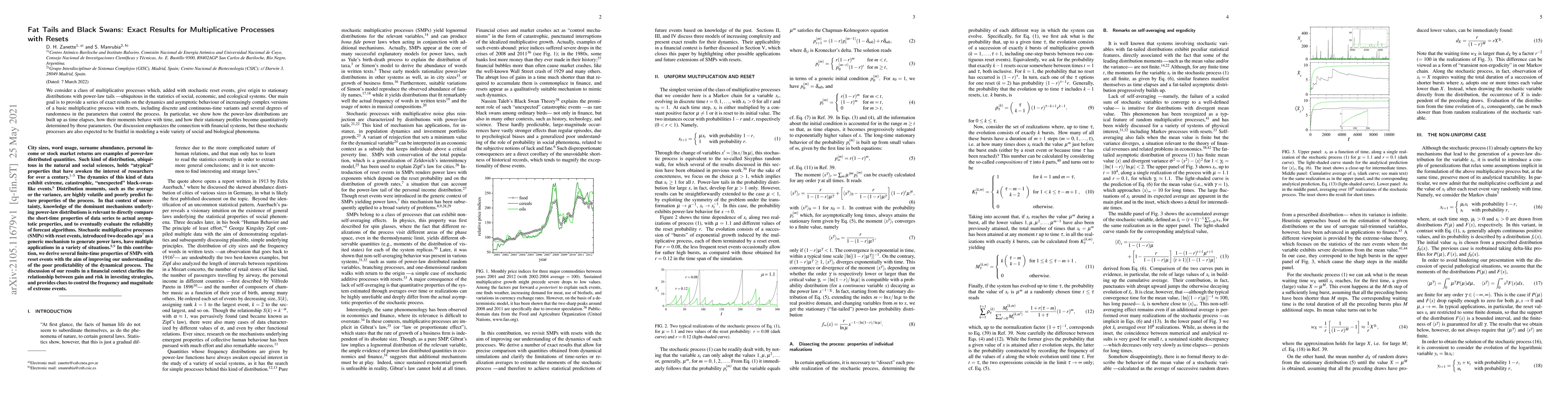This paper investigates multiplicative processes with stochastic resets, revealing exact results for their dynamics and asymptotic behavior, particularly focusing on the emergence of power-law tails. The study highlights the processes' relevance in modeling financial systems and other social and biological phenomena.