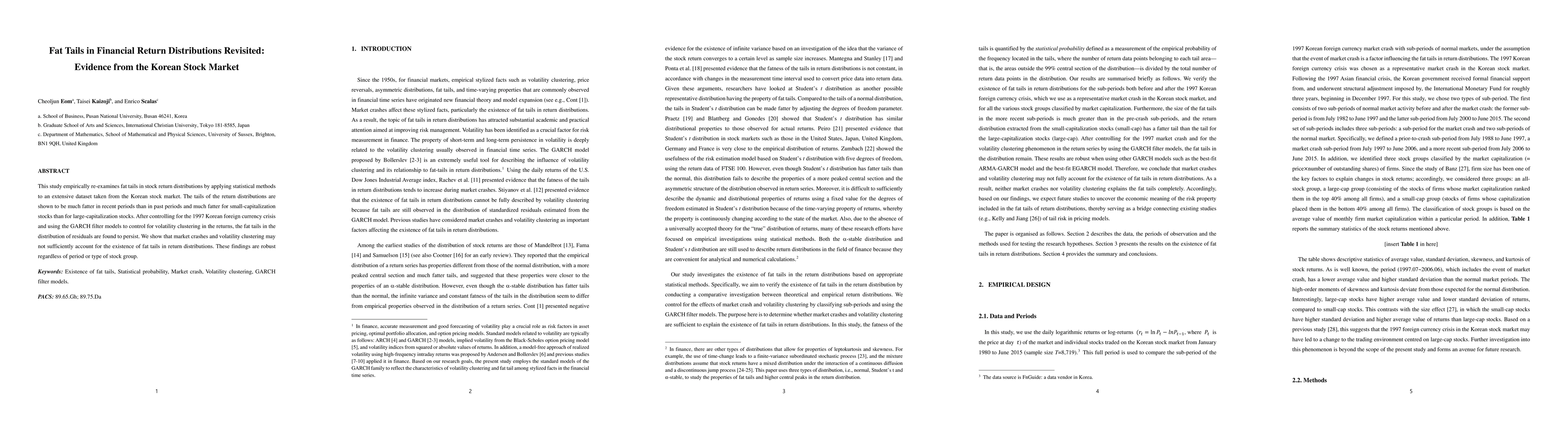 This study distinguishes itself by focusing on the Korean stock market, revisiting fat tails in return distributions with a focus on recent periods and small-cap stocks, and demonstrating that market crashes and volatility clustering alone cannot fully account for fat tails.