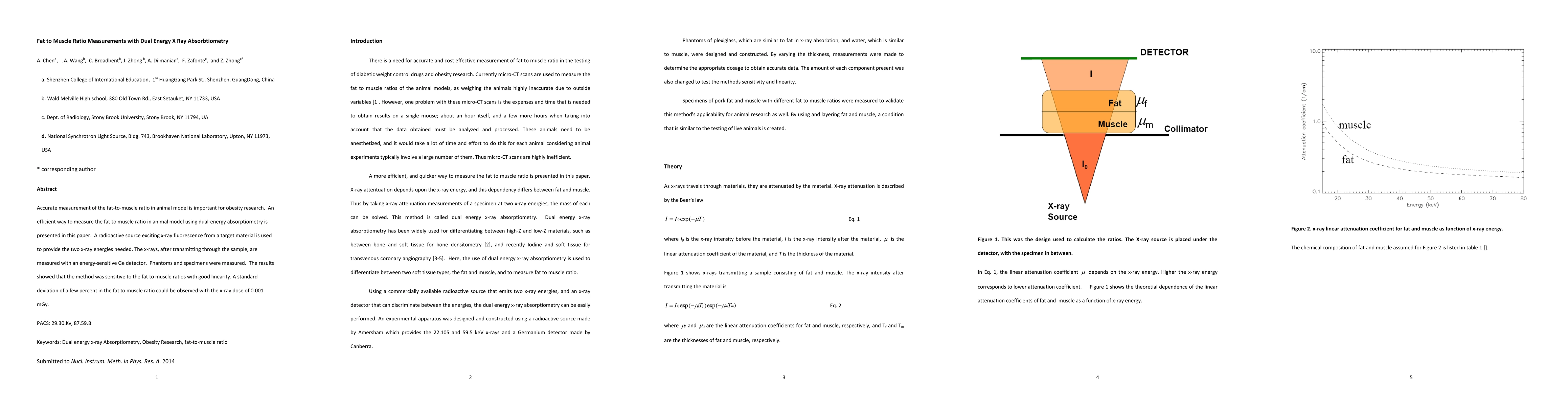 Accurate measurement of the fat-to-muscle ratio in animal model is important for obesity research. An efficient way to measure the fat to muscle ratio in animal model using dual-energy absorptiometry is presented in this paper. A radioactive source exciting x-ray fluorescence from a target material is used to provide the two x-ray energies needed. The x-rays, after transmitting through the sample, are measured with an energy-sensitive Ge detector. Phantoms and specimens were measured. The results showed that the method was sensitive to the fat to muscle ratios with good linearity. A standard deviation of a few percent in the fat to muscle ratio could be observed with the x-ray dose of 0.001 mGy.