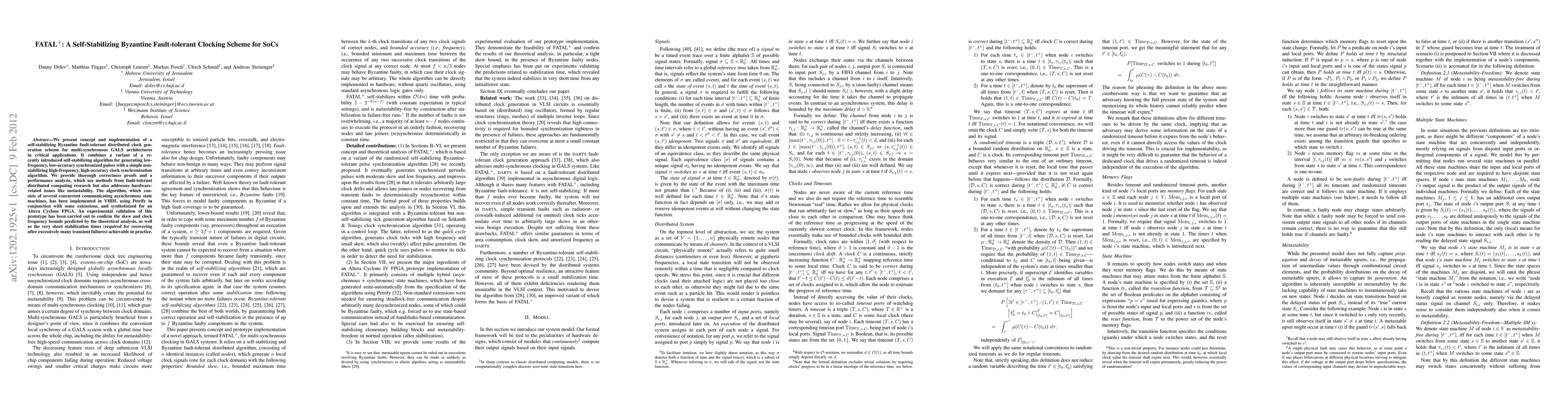 This paper proposes a self-stabilizing Byzantine fault-tolerant clocking scheme for SoCs, combining a low-frequency, low-accuracy stabilization algorithm with a high-frequency synchronization method. The algorithm was implemented in VHDL and validated on an Altera FPGA, showing promising short stabilization times and performance.
