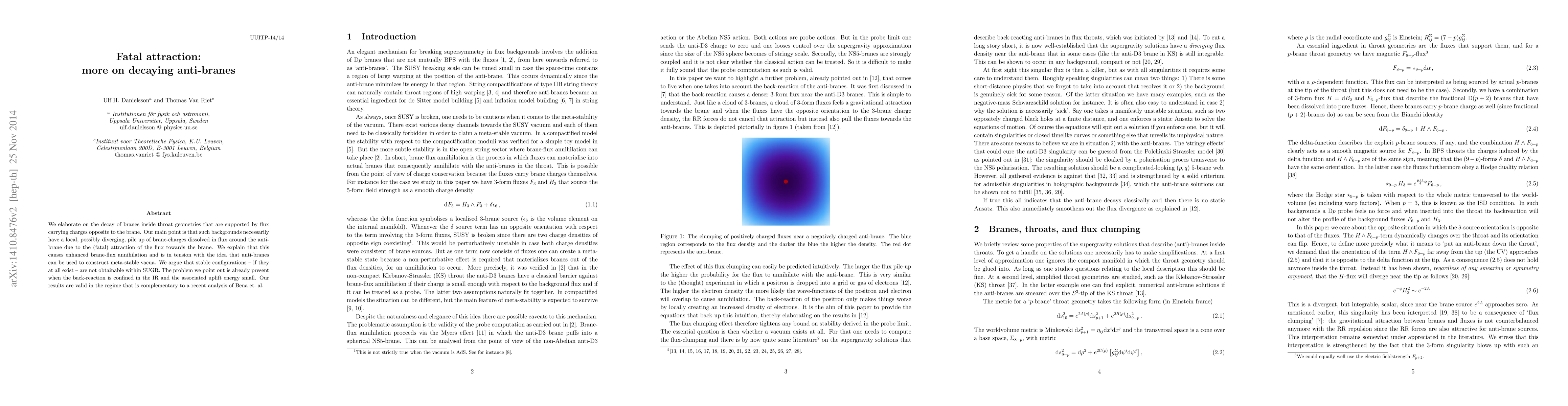 We elaborate on the decay of branes inside throat geometries that are supported by flux carrying charges opposite to the brane. Our main point is that such backgrounds necessarily have a local, possibly diverging, pile up of brane-charges dissolved in flux around the anti-brane due to the (fatal) attraction of the flux towards the brane. We explain that this causes enhanced brane-flux annihilation and is in tension with the idea that anti-branes can be used to construct meta-stable vacua. We argue that stable configurations -- if they at all exist -- are not obtainable within SUGR. The problem we point out is already present when the back-reaction is confined in the IR and the associated uplift energy small. Our results are valid in the regime that is complementary to a recent analysis of Bena et. al.