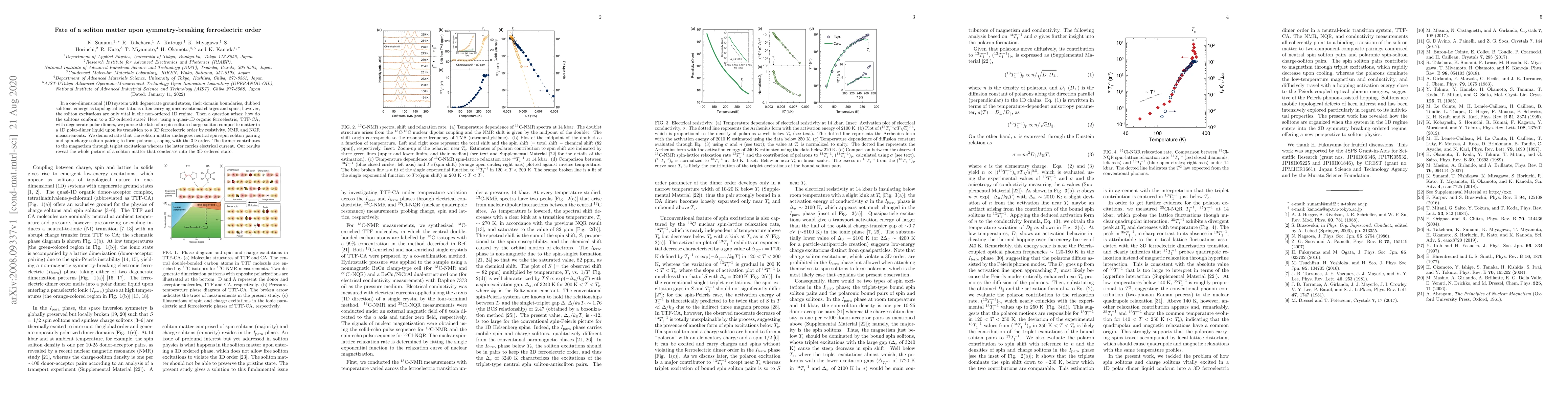 In a one-dimensional (1D) system with degenerate ground states, their domain boundaries, dubbed solitons, emerge as topological excitations often carrying unconventional charges and spins; however, the soliton excitations are only vital in the non-ordered 1D regime. Then a question arises; how do the solitons conform to a 3D ordered state? Here, using a quasi-1D organic ferroelectric, TTF-CA, with degenerate polar dimers, we pursue the fate of a spin-soliton charge-soliton composite matter in a 1D polar-dimer liquid upon its transition to a 3D ferroelectric order by resistivity, NMR and NQR measurements. We demonstrate that the soliton matter undergoes neutral spin-spin soliton pairing and spin-charge soliton pairing to form polarons, coping with the 3D order. The former contributes to the magnetism through triplet excitations whereas the latter carries electrical current. Our results reveal the whole picture of a soliton matter that condenses into the 3D ordered state.