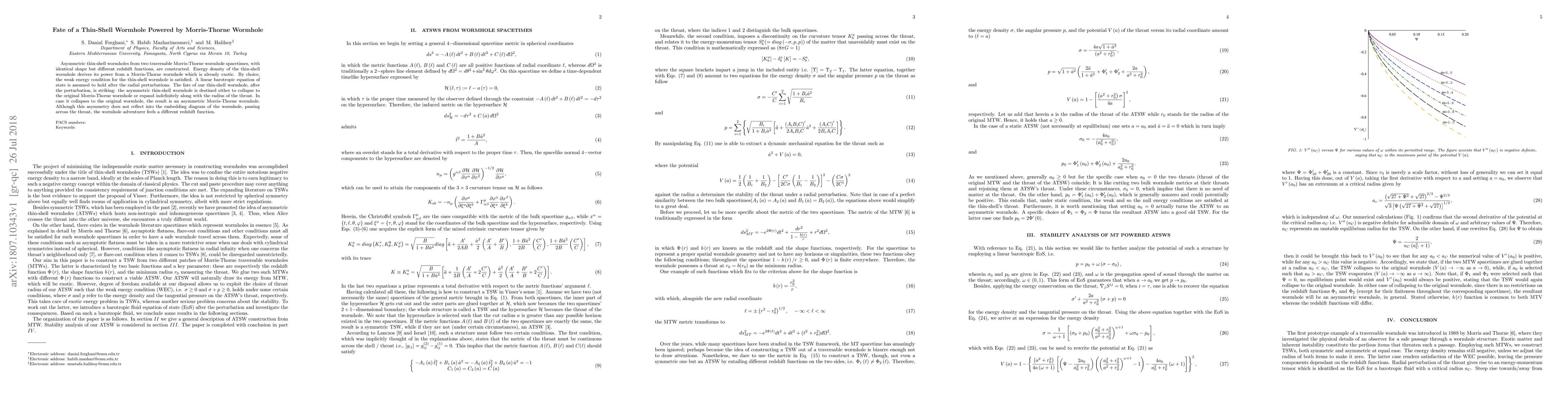 This research constructs asymmetric thin-shell wormholes from Morris-Thorne wormholes and explores their fate post-perturbation. The thin-shell wormhole either collapses back into the original wormhole or expands indefinitely, resulting in an asymmetric Morris-Thorne wormhole.