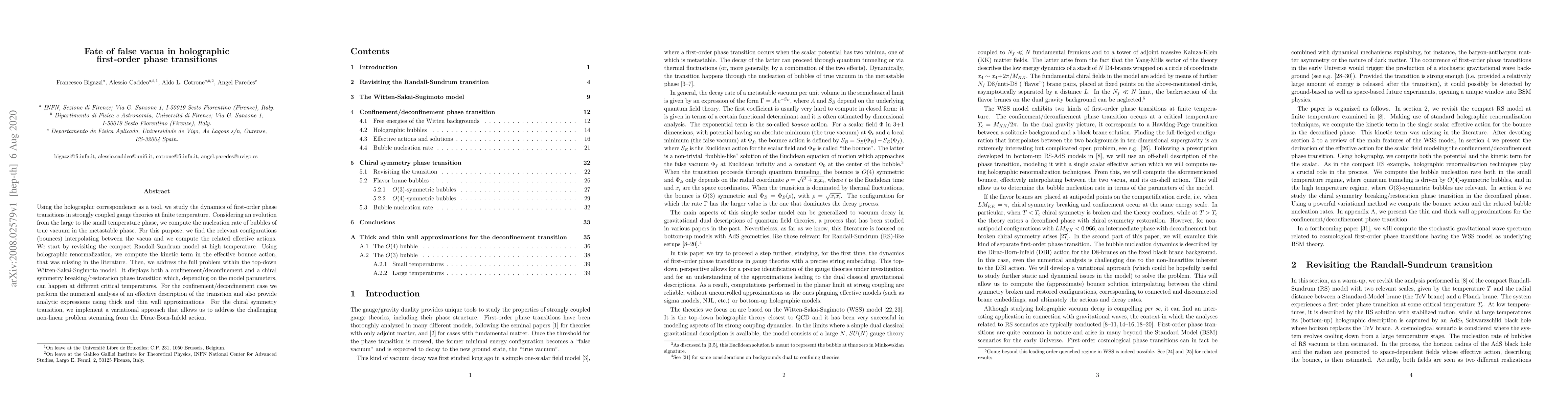 Using the holographic correspondence as a tool, we study the dynamics of first-order phase transitions in strongly coupled gauge theories at finite temperature. Considering an evolution from the large to the small temperature phase, we compute the nucleation rate of bubbles of true vacuum in the metastable phase. For this purpose, we find the relevant configurations (bounces) interpolating between the vacua and we compute the related effective actions. We start by revisiting the compact Randall-Sundrum model at high temperature. Using holographic renormalization, we compute the kinetic term in the effective bounce action, that was missing in the literature. Then, we address the full problem within the top-down Witten-Sakai-Sugimoto model. It displays both a confinement/deconfinement and a chiral symmetry breaking/restoration phase transition which, depending on the model parameters, can happen at different critical temperatures. For the confinement/deconfinement case we perform the numerical analysis of an effective description of the transition and also provide analytic expressions using thick and thin wall approximations. For the chiral symmetry transition, we implement a variational approach that allows us to address the challenging non-linear problem stemming from the Dirac-Born-Infeld action.