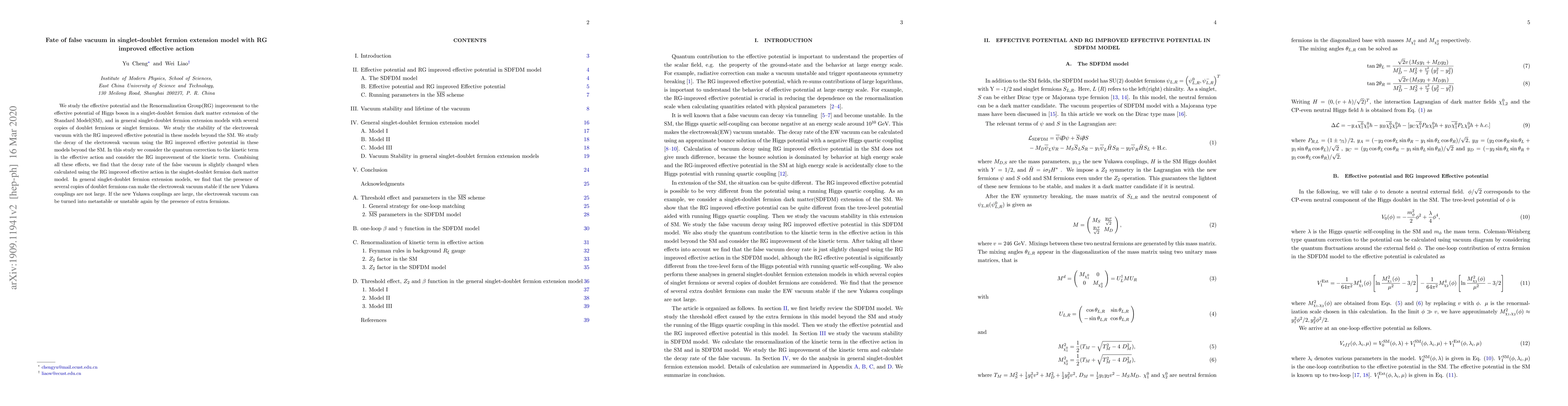 We study the effective potential and the Renormalization Group(RG) improvement to the effective potential of Higgs boson in a singlet-doublet fermion dark matter extension of the Standard Model(SM), and in general singlet-doublet fermion extension models with several copies of doublet fermions or singlet fermions. We study the stability of the electroweak vacuum with the RG improved effective potential in these models beyond the SM. We study the decay of the electroweak vacuum using the RG improved effective potential in these models beyond the SM. In this study we consider the quantum correction to the kinetic term in the effective action and consider the RG improvement of the kinetic term. Combining all these effects, we find that the decay rate of the false vacuum is slightly changed when calculated using the RG improved effective action in the singlet-doublet fermion dark matter model. In general singlet-doublet fermion extension models, we find that the presence of several copies of doublet fermions can make the electroweak vacuum stable if the new Yukawa couplings are not large. If the new Yukawa couplings are large, the electroweak vacuum can be turned into metastable or unstable again by the presence of extra fermions.