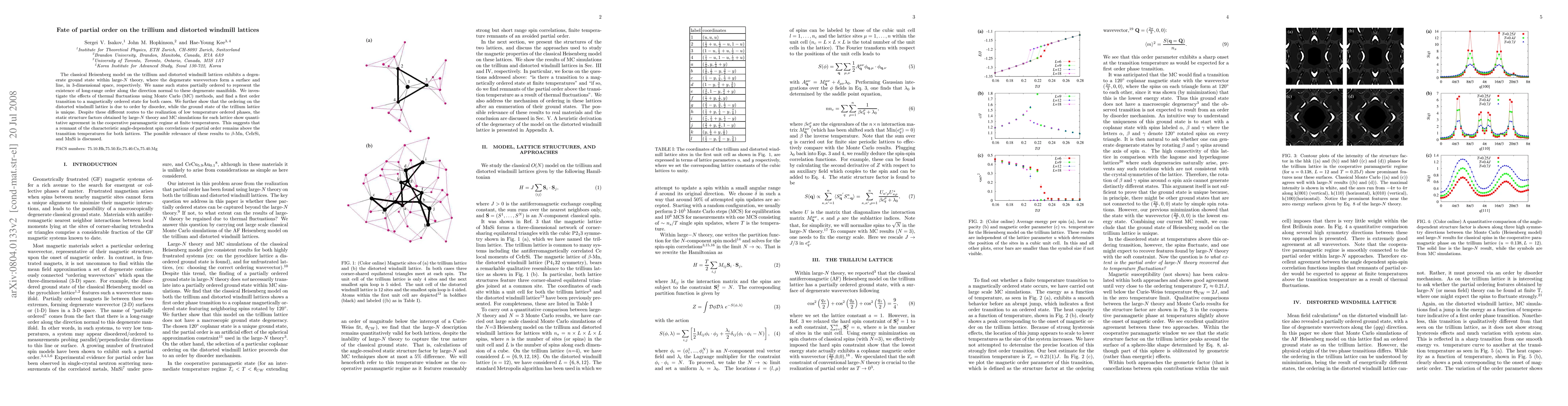 The classical Heisenberg model on the trillium and distorted windmill lattices exhibits a degenerate ground state within large-$N$ theory, where the degenerate wavevectors form a surface and line, in 3-dimensional space, respectively. We name such states partially ordered to represent the existence of long-range order along the direction normal to these degenerate manifolds. We investigate the effects of thermal fluctuations using Monte Carlo (MC) methods, and find a first order transition to a magnetically ordered state for both cases. We further show that the ordering on the distorted windmill lattice is due to order by disorder, while the ground state of the trillium lattice is unique. Despite these different routes to the realization of low temperature ordered phases, the static structure factors obtained by large-$N$ theory and MC simulations for each lattice show quantitative agreement in the cooperative paramagnetic regime at finite temperatures. This suggests that a remnant of the characteristic angle-dependent spin correlations of partial order remains above the transition temperatures for both lattices. The possible relevance of these results to $\beta$-Mn, CeIrSi, and MnSi is discussed.