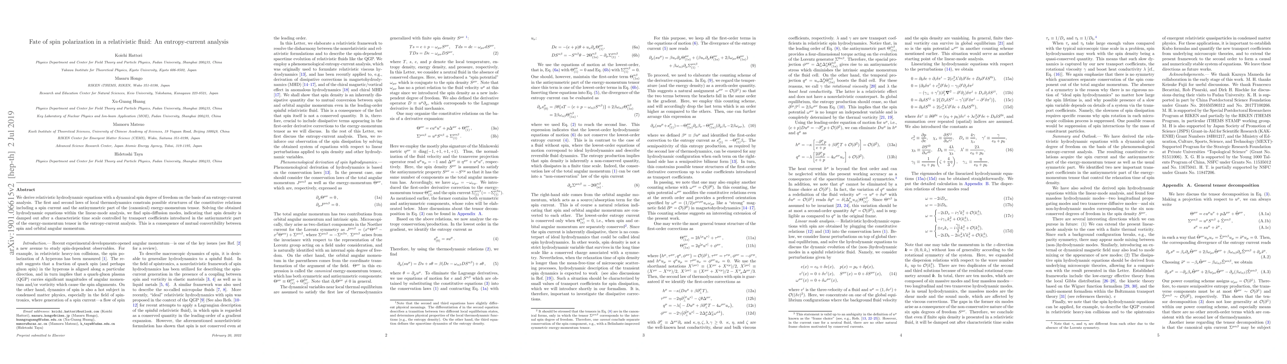 This paper derives relativistic hydrodynamic equations incorporating a dynamical spin degree of freedom through entropy-current analysis. It identifies spin-diffusion modes, revealing that spin density dissipates over time due to transport coefficients, stemming from the interplay between spin and orbital angular momentum.