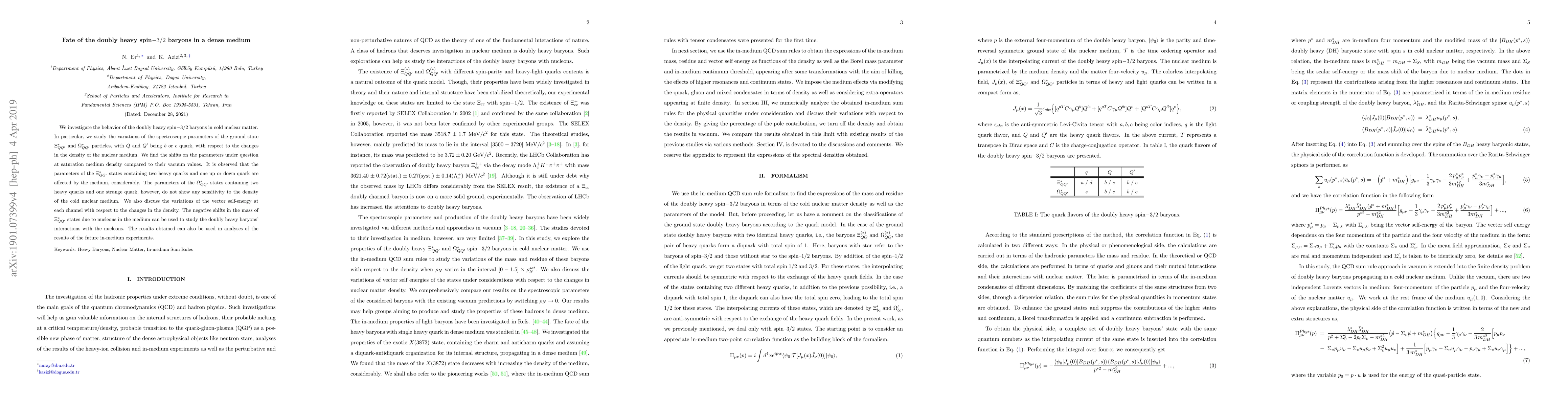 This paper examines the behavior of doubly heavy spin-$3/2$ baryons ($\Xi^*_{QQ'}$ and $\Omega^*_{QQ'}$) in cold nuclear matter, finding significant shifts in the spectroscopic parameters of $\Xi^*_{QQ'}$ with increasing density but no such sensitivity in $\Omega^*_{QQ'}$. The study also discusses the implications for future in-medium experiments.