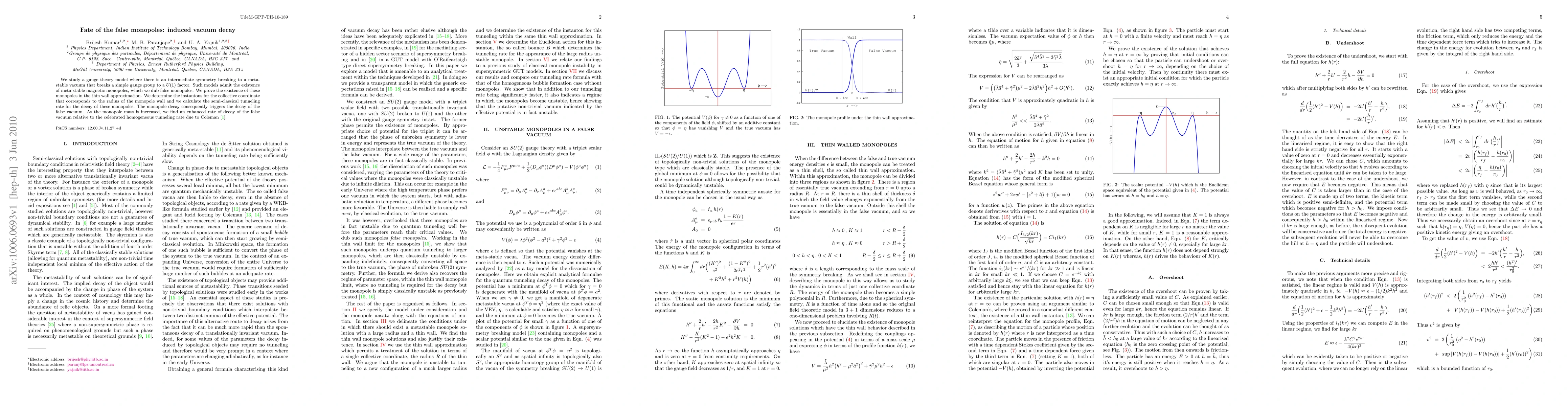 This paper investigates a gauge theory where an intermediate symmetry breaking leads to meta-stable magnetic monopoles, termed false monopoles, and demonstrates their existence. It calculates the tunneling rate for their decay, which in turn induces the decay of the false vacuum, showing a higher decay rate than the homogeneous tunneling rate.
