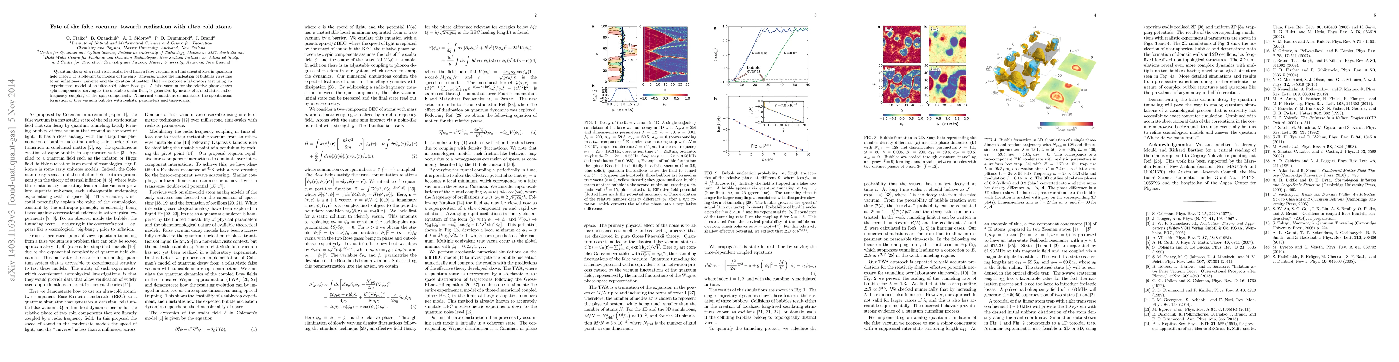 This paper proposes a laboratory test using ultra-cold atoms to simulate the quantum decay of a false vacuum in quantum field theory, relevant to early universe models. The experiment employs an ultra-cold spinor Bose gas to mimic the unstable scalar field, with numerical simulations showing the spontaneous formation of true vacuum bubbles.