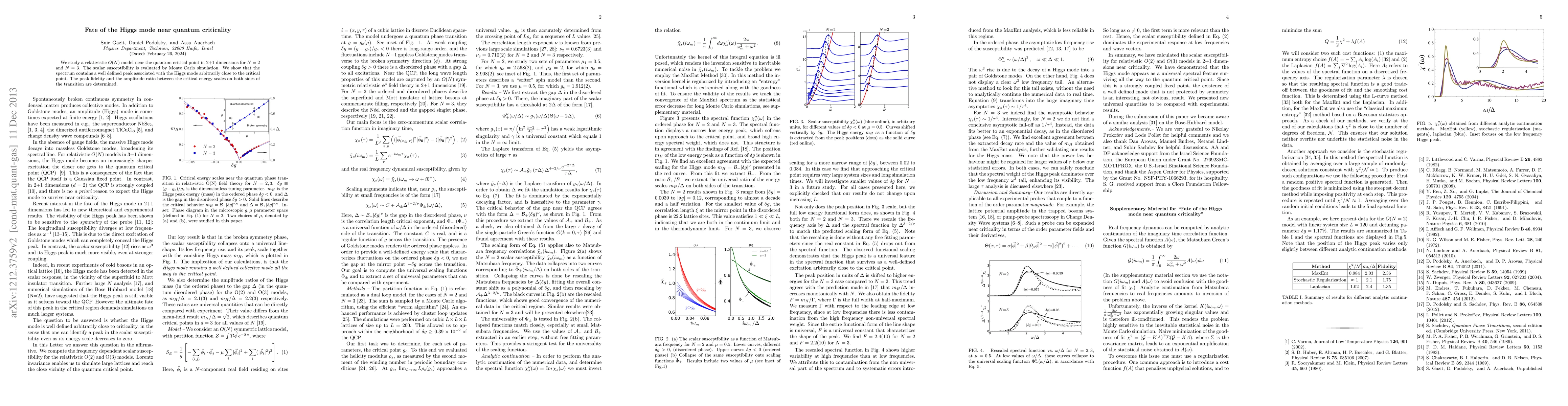 We study the relativistic O(N) field theory near the quantum critical point in 2+1 dimensions for N=2 and N=3. The scalar susceptibility is evaluated by Monte Carlo simulation. We show that the spectrum contains a peak associated with the Higgs mode, which remains well-defined all the way to the critical point. The fidelity of this peak and the amplitude ratio between the critical energy scales on both sides of the transition are computed.
