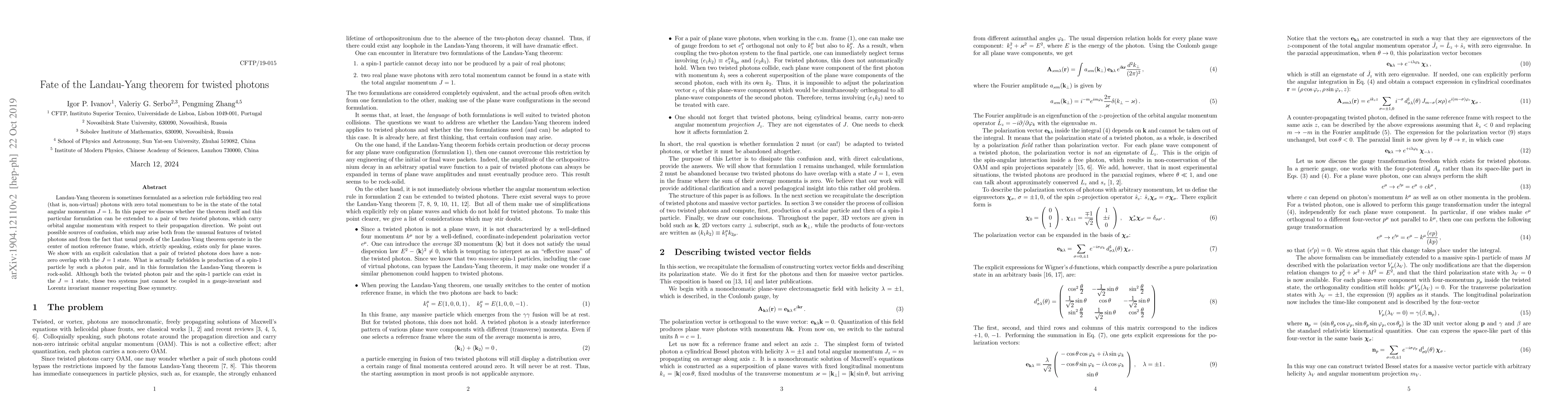 Landau-Yang theorem is sometimes formulated as a selection rule forbidding two real (that is, non-virtual) photons with zero total momentum to be in the state of the total angular momentum J=1. In this paper we discuss whether the theorem itself and this particular formulation can be extended to a pair of two {\em twisted} photons, which carry orbital angular momentum with respect to their propagation direction. We point out possible sources of confusion, which may arise both from the unusual features of twisted photons and from the fact that usual proofs of the Landau-Yang theorem operate in the center of motion reference frame, which, strictly speaking, exists only for plane waves. We show with an explicit calculation that a pair of twisted photons does have a non-zero overlap with the J=1 state. What is actually forbidden is production of a spin-1 particle by such a photon pair, and in this formulation the Landau-Yang theorem is rock-solid. Although both the twisted photon pair and the spin-1 particle can exist in the J=1 state, these two systems just cannot be coupled in a gauge-invariant and Lorentz invariant manner respecting Bose symmetry.