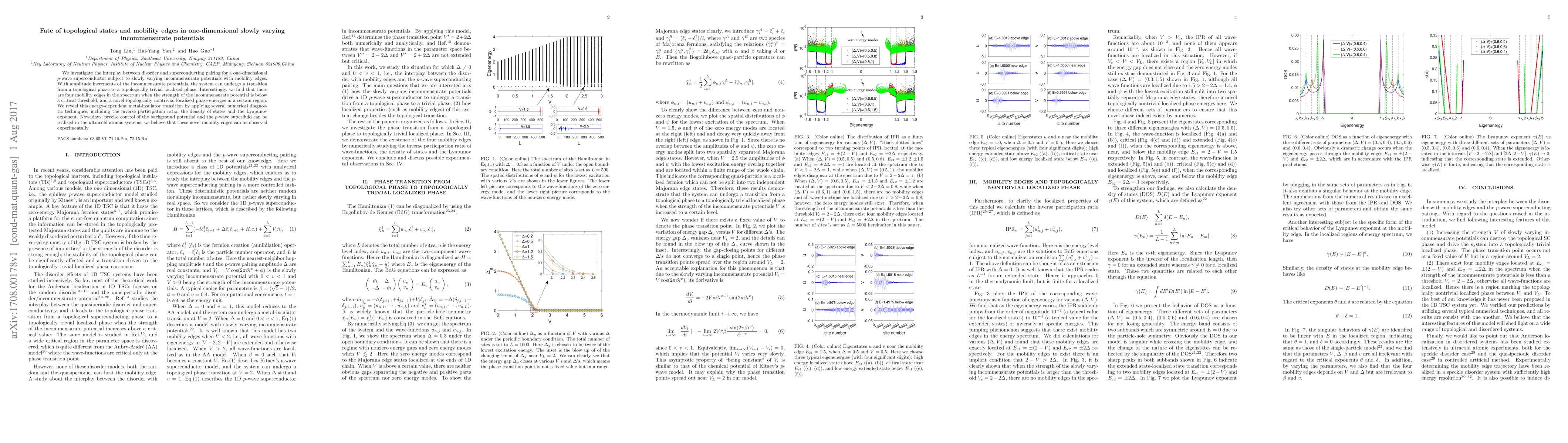 This paper explores the effects of disorder on topological states in a one-dimensional $p$-wave superconductor under slowly varying incommensurate potentials, revealing transitions between topological and trivial phases, four mobility edges, and a novel topologically nontrivial localized phase. Experimental observation of these phenomena in ultracold atomic systems is proposed.