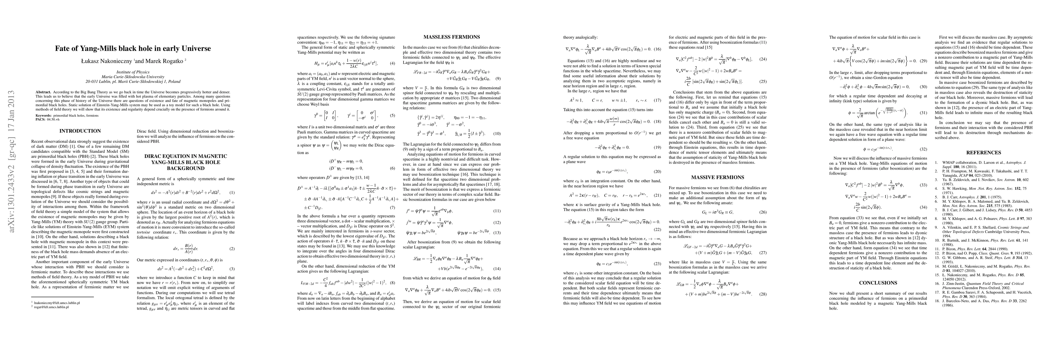 According to the Big Bang Theory as we go back in time the Universe becomes progressively hotter and denser. This leads us to believe that the early Universe was filled with hot plasma of elementary particles. Among many questions concerning this phase of history of the Universe there are questions of existence and fate of magnetic monopoles and primordial black holes. Static solution of Einstein-Yang-Mills system may be used as a toy model for such a black hole. Using methods of field theory we will show that its existence and regularity depend crucially on the presence of fermions around it.