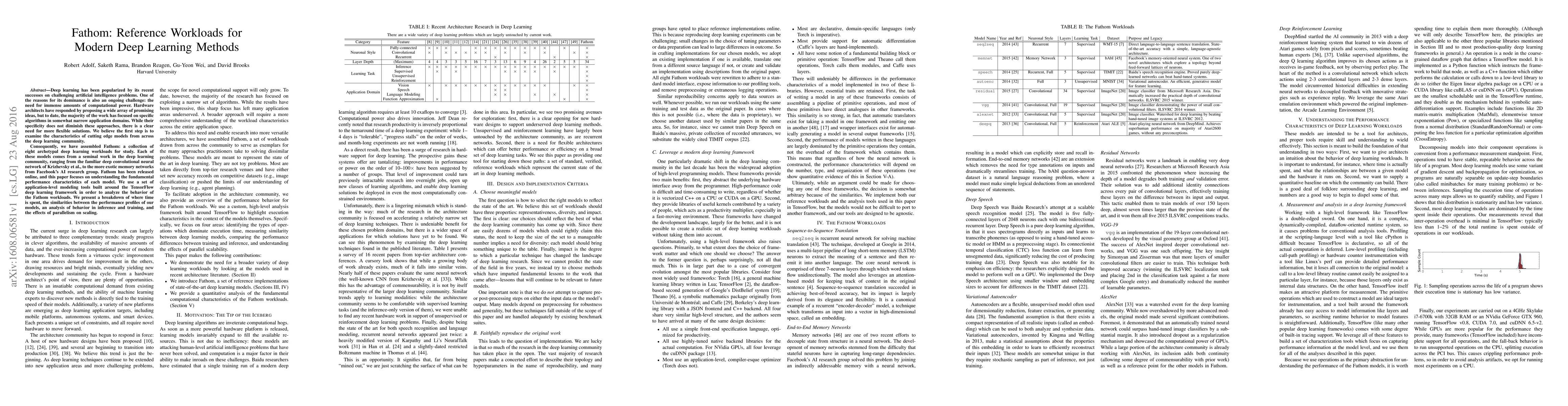 This paper introduces Fathom, a collection of eight archetypal deep learning workloads from seminal research, aiming to analyze their performance characteristics. Using TensorFlow-based tools, the study examines time distribution, performance profiles, and the impact of parallelism, highlighting the need for flexible solutions across diverse deep learning applications.