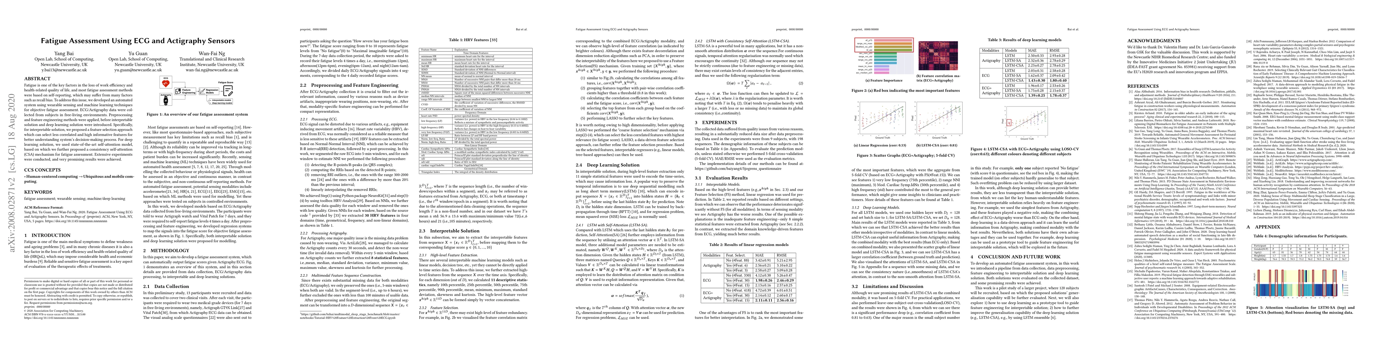 Fatigue is one of the key factors in the loss of work efficiency and health-related quality of life, and most fatigue assessment methods were based on self-reporting, which may suffer from many factors such as recall bias. To address this issue, we developed an automated system using wearable sensing and machine learning techniques for objective fatigue assessment. ECG/Actigraphy data were collected from subjects in free-living environments. Preprocessing and feature engineering methods were applied, before interpretable solution and deep learning solution were introduced. Specifically, for interpretable solution, we proposed a feature selection approach which can select less correlated and high informative features for better understanding system's decision-making process. For deep learning solution, we used state-of-the-art self-attention model, based on which we further proposed a consistency self-attention (CSA) mechanism for fatigue assessment. Extensive experiments were conducted, and very promising results were achieved.