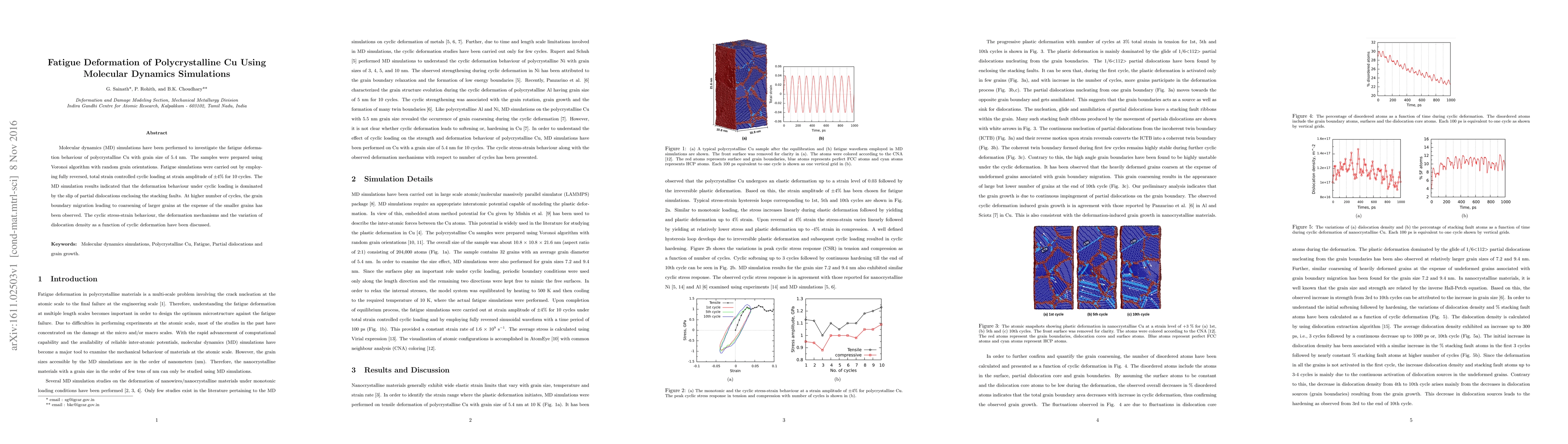This study uses molecular dynamics simulations to explore the fatigue deformation behavior of 5.4 nm grain polycrystalline Cu under cyclic loading, revealing that slip of partial dislocations and grain boundary migration dominate the deformation mechanisms, with grain coarsening observed at higher cycles.