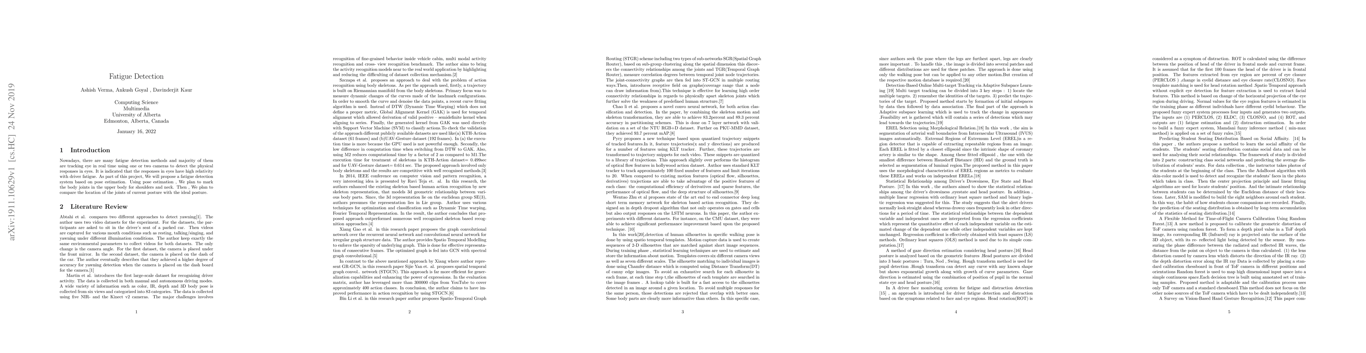 Nowadays, there are many fatigue detection methods and the majority of them are tracking eye in real-time using one or two cameras to detect the physical responses in eyes. It is indicated that the responses in eyes have high relativity with driver fatigue. As part of this project, We will propose a fatigue detection system based on pose estimation. Using pose estimation, We plan to mark the body joints in the upper body for shoulders and neck. Then, we plan to compare the location of the joints of the current posture with the ideal posture.