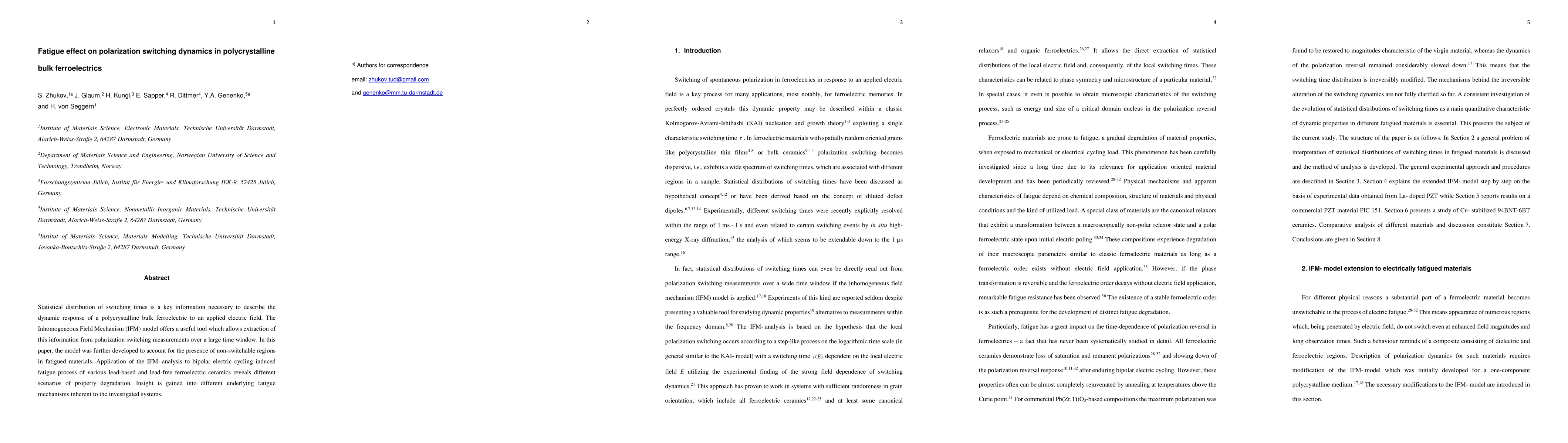 Statistical distribution of switching times is a key information necessary to describe the dynamic response of a polycrystalline bulk ferroelectric to an applied electric field. The Inhomogeneous Field Mechanism (IFM) model offers a useful tool which allows extraction of this information from polarization switching measurements over a large time window. In this paper, the model was further developed to account for the presence of non-switchable regions in fatigued materials. Application of the IFM- analysis to bipolar electric cycling induced fatigue process of various lead-based and lead-free ferroelectric ceramics reveals different scenarios of property degradation. Insight is gained into different underlying fatigue mechanisms inherent to the investigated systems.