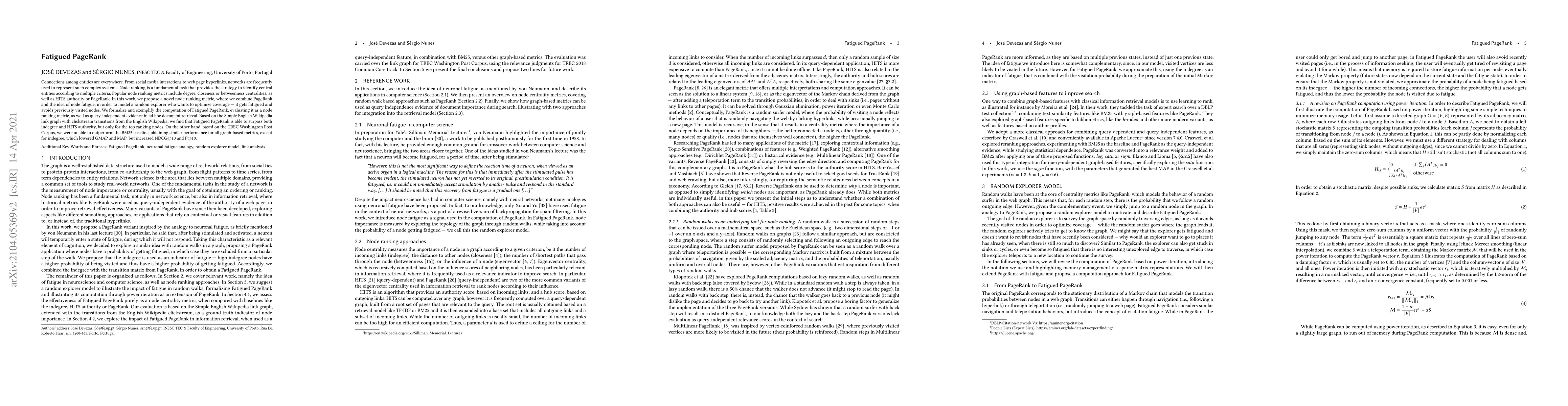 Connections among entities are everywhere. From social media interactions to web page hyperlinks, networks are frequently used to represent such complex systems. Node ranking is a fundamental task that provides the strategy to identify central entities according to multiple criteria. Popular node ranking metrics include degree, closeness or betweenness centralities, as well as HITS authority or PageRank. In this work, we propose a novel node ranking metric, where we combine PageRank and the idea of node fatigue, in order to model a random explorer who wants to optimize coverage - it gets fatigued and avoids previously visited nodes. We formalize and exemplify the computation of Fatigued PageRank, evaluating it as a node ranking metric, as well as query-independent evidence in ad hoc document retrieval. Based on the Simple English Wikipedia link graph with clickstream transitions from the English Wikipedia, we find that Fatigued PageRank is able to surpass both indegree and HITS authority, but only for the top ranking nodes. On the other hand, based on the TREC Washington Post Corpus, we were unable to outperform the BM25 baseline, obtaining similar performance for all graph-based metrics, except for indegree, which lowered GMAP and MAP, but increased NDCG@10 and P@10.