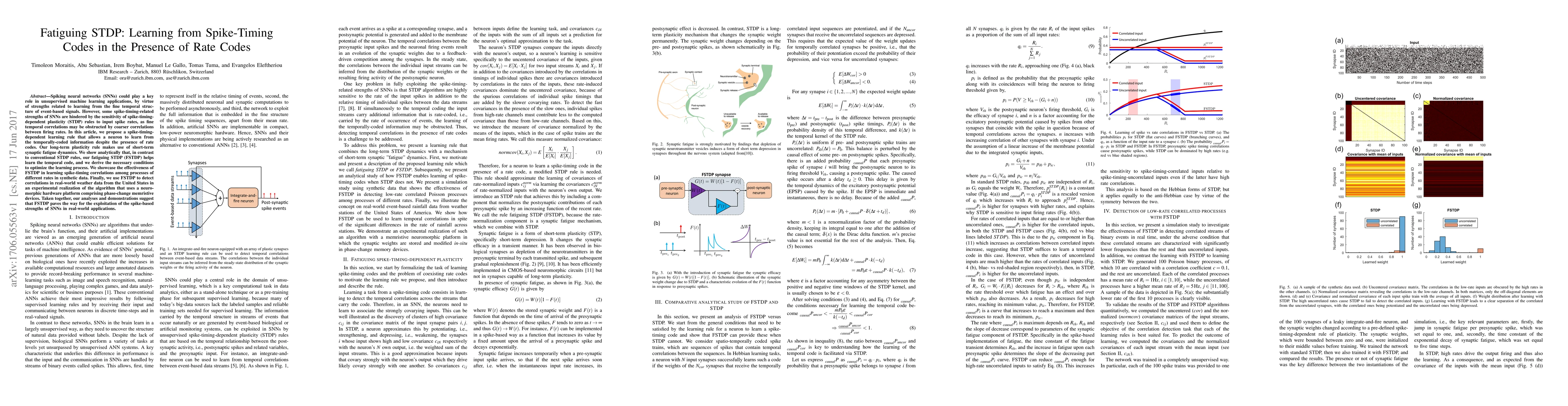 Spiking neural networks (SNNs) could play a key role in unsupervised machine learning applications, by virtue of strengths related to learning from the fine temporal structure of event-based signals. However, some spike-timing-related strengths of SNNs are hindered by the sensitivity of spike-timing-dependent plasticity (STDP) rules to input spike rates, as fine temporal correlations may be obstructed by coarser correlations between firing rates. In this article, we propose a spike-timing-dependent learning rule that allows a neuron to learn from the temporally-coded information despite the presence of rate codes. Our long-term plasticity rule makes use of short-term synaptic fatigue dynamics. We show analytically that, in contrast to conventional STDP rules, our fatiguing STDP (FSTDP) helps learn the temporal code, and we derive the necessary conditions to optimize the learning process. We showcase the effectiveness of FSTDP in learning spike-timing correlations among processes of different rates in synthetic data. Finally, we use FSTDP to detect correlations in real-world weather data from the United States in an experimental realization of the algorithm that uses a neuromorphic hardware platform comprising phase-change memristive devices. Taken together, our analyses and demonstrations suggest that FSTDP paves the way for the exploitation of the spike-based strengths of SNNs in real-world applications.