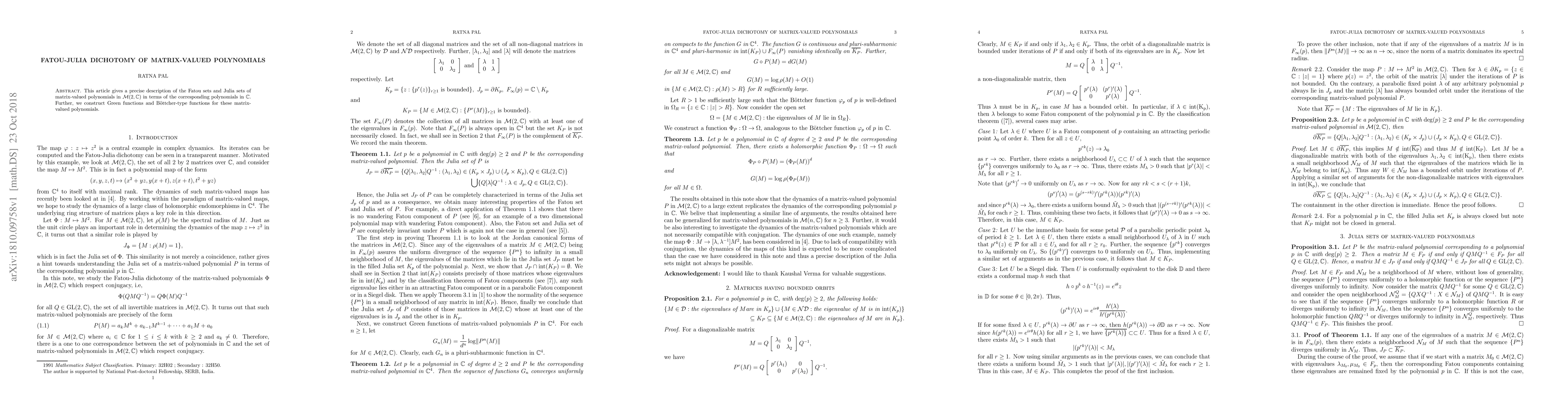 This article gives a precise description of the Fatou sets and Julia sets of matrix-valued polynomials in $\mathcal{M}(2,\mathbb{C})$ in terms of the corresponding polynomials in $\mathbb{C}$. Further, we construct Green functions and B\"{o}ttcher-type functions for these matrix-valued polynomials.