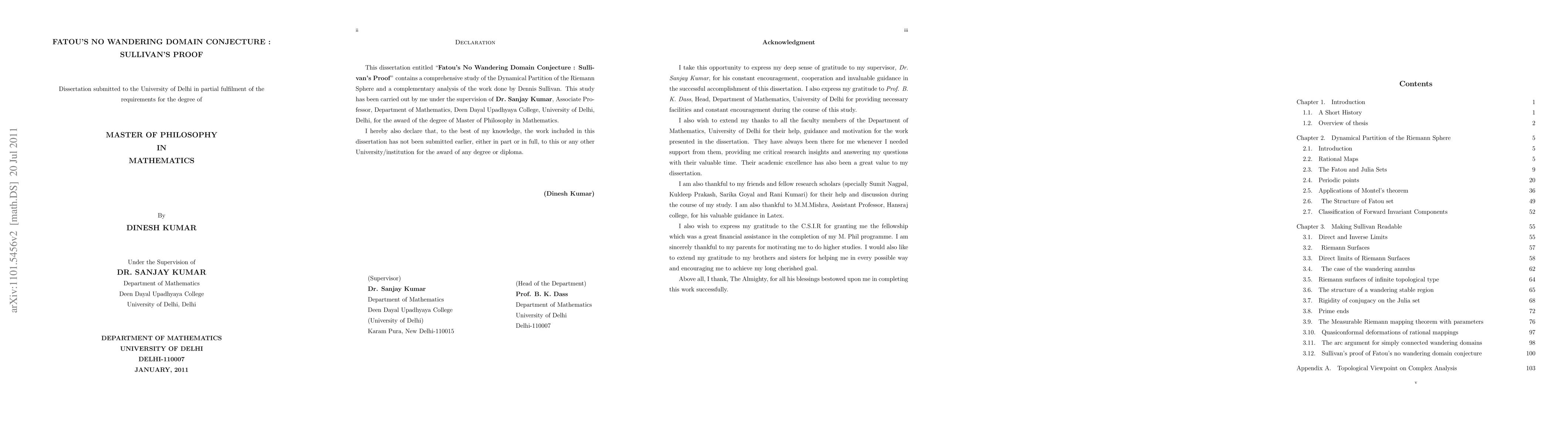 Summary: This dissertation thoroughly examines Dennis Sullivan's proof of Fatou's No Wandering Domain Conjecture, focusing on the Dynamical Partition of the Riemann Sphere and Sullivan's contributions to the field.
