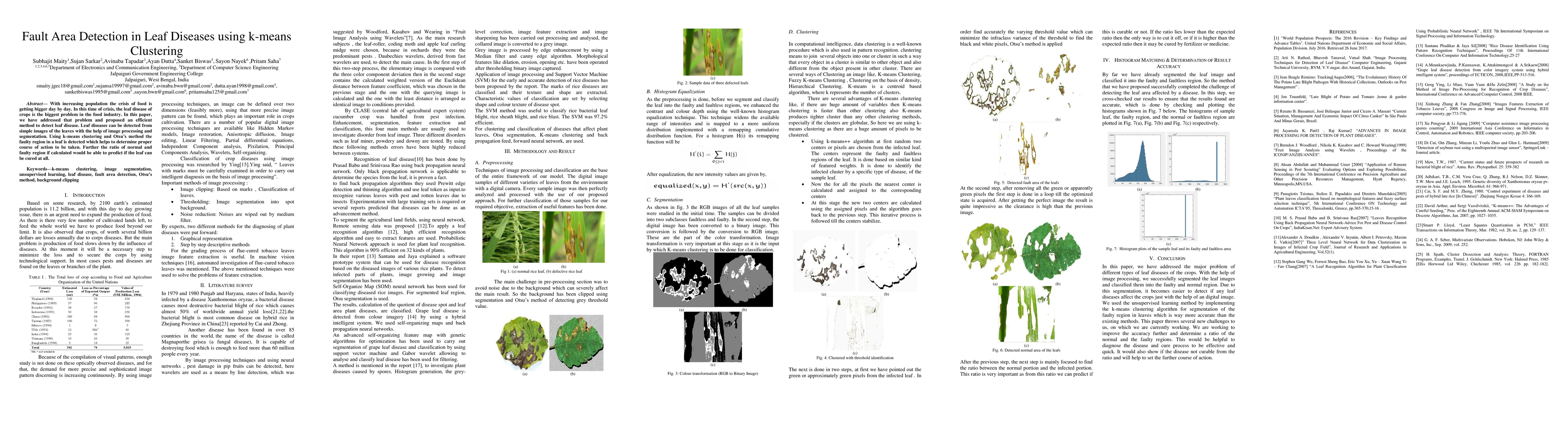 This paper proposes a method to detect leaf diseases using k-means clustering and Otsu's method, enabling the identification of faulty regions in crops and predicting potential cure success rates.
