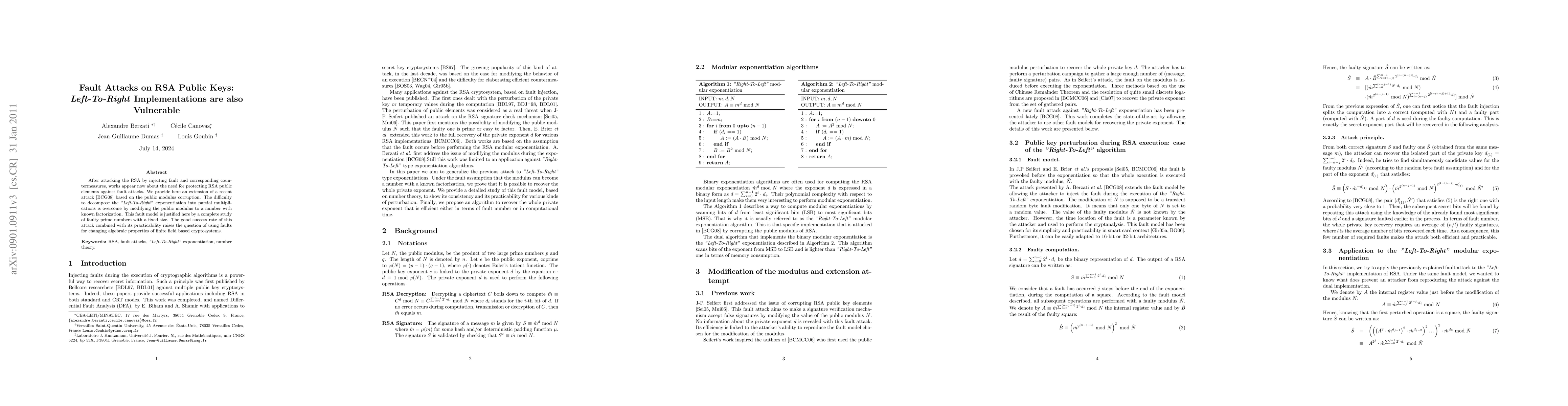 This paper explores fault attacks on RSA public keys, demonstrating vulnerabilities in "Left-To-Right" implementations through modulus corruption. It successfully overcomes the challenge of decomposing exponentiation by modifying the public modulus, raising concerns about the security of finite field-based cryptosystems against such attacks.