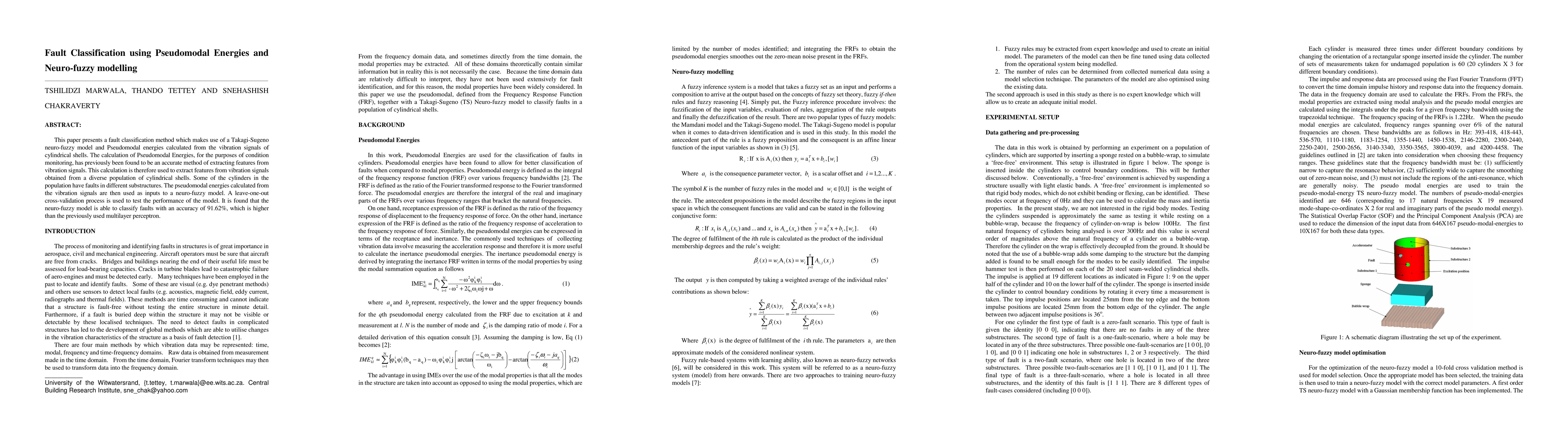This paper presents a fault classification method which makes use of a Takagi-Sugeno neuro-fuzzy model and Pseudomodal energies calculated from the vibration signals of cylindrical shells. The calculation of Pseudomodal Energies, for the purposes of condition monitoring, has previously been found to be an accurate method of extracting features from vibration signals. This calculation is therefore used to extract features from vibration signals obtained from a diverse population of cylindrical shells. Some of the cylinders in the population have faults in different substructures. The pseudomodal energies calculated from the vibration signals are then used as inputs to a neuro-fuzzy model. A leave-one-out cross-validation process is used to test the performance of the model. It is found that the neuro-fuzzy model is able to classify faults with an accuracy of 91.62%, which is higher than the previously used multilayer perceptron.