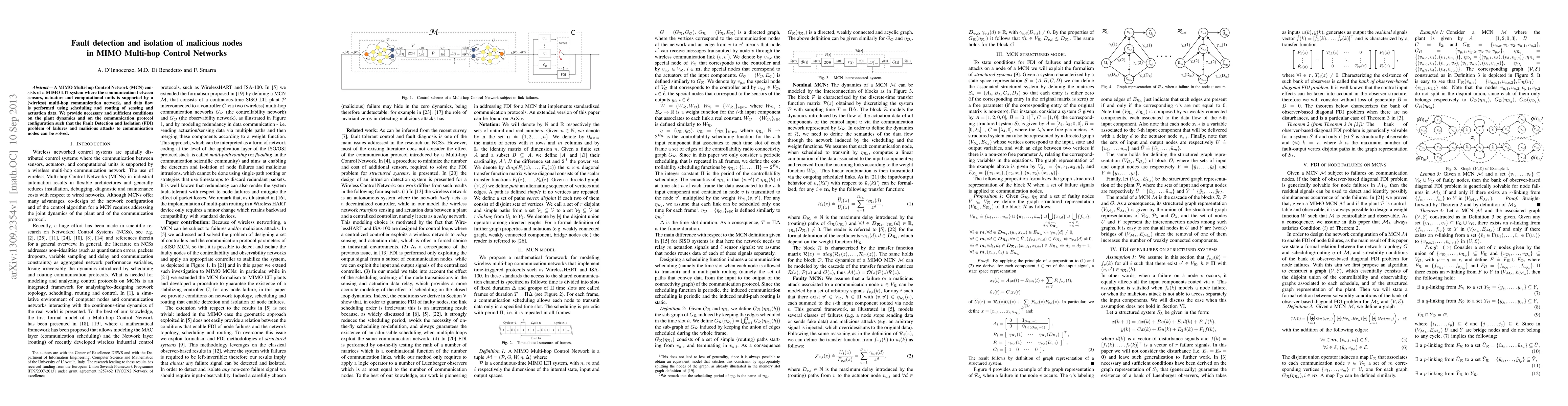 A MIMO Multi-hop Control Network (MCN) consists of a MIMO LTI system where the communication between sensors, actuators and computational units is supported by a (wireless) multi-hop communication network, and data flow is performed using scheduling and routing of sensing and actuation data. We provide necessary and sufficient conditions on the plant dynamics and on the communication protocol configuration such that the Fault Detection and Isolation (FDI) problem of failures and malicious attacks to communication nodes can be solved.