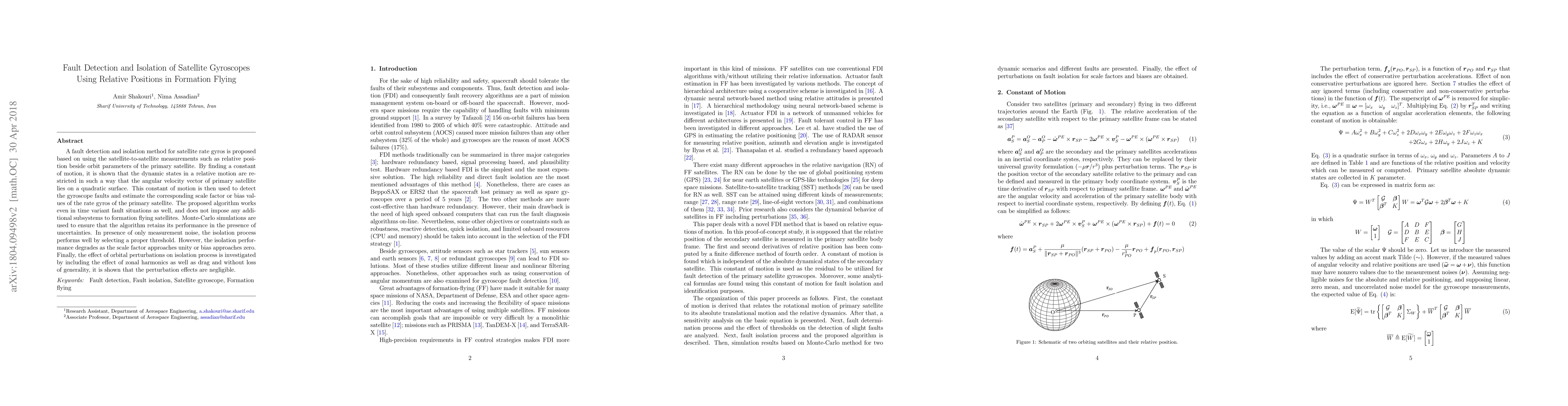 This paper proposes a fault detection and isolation method for satellite gyroscopes using relative position measurements, showing that angular velocity lies on a quadratic surface. The method effectively identifies gyroscope faults without additional subsystems, and maintains performance under uncertainties, though it struggles with small scale factors or biases.