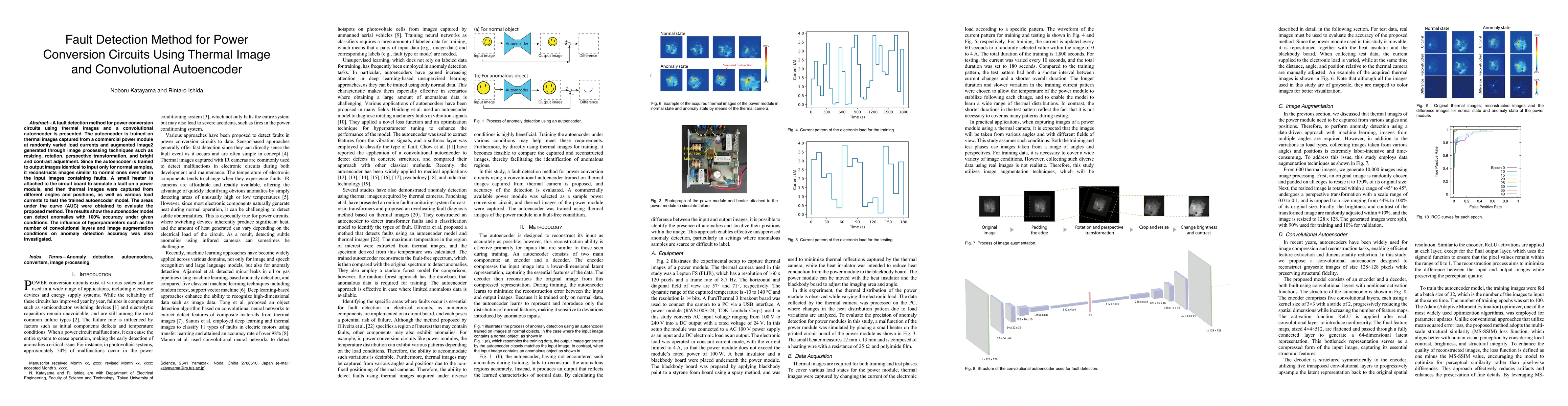 The research presents a fault detection method for power conversion circuits using thermal images and a convolutional autoencoder. The autoencoder is trained on thermal images from a commercial power module under varied load currents, with augmented images generated via image processing techniques. A small heater simulates faults, and thermal images are captured from various angles, positions, and load currents to test the model.