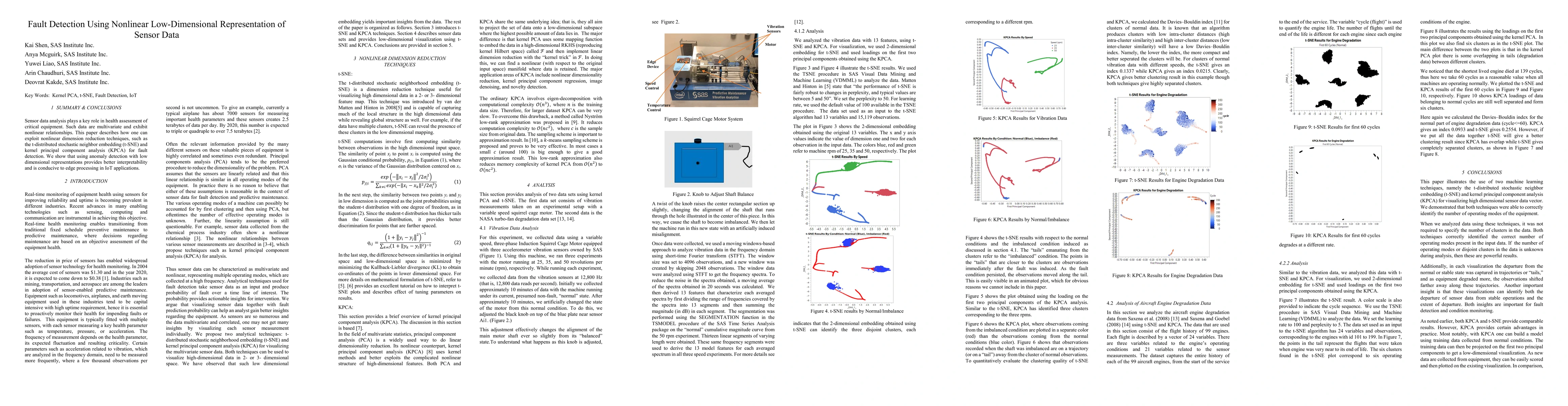 This paper explores the use of nonlinear dimension reduction techniques like t-SNE and KPCA for analyzing multivariate sensor data to detect faults. It demonstrates that anomaly detection based on low-dimensional representations enhances interpretability and supports edge processing in IoT applications.