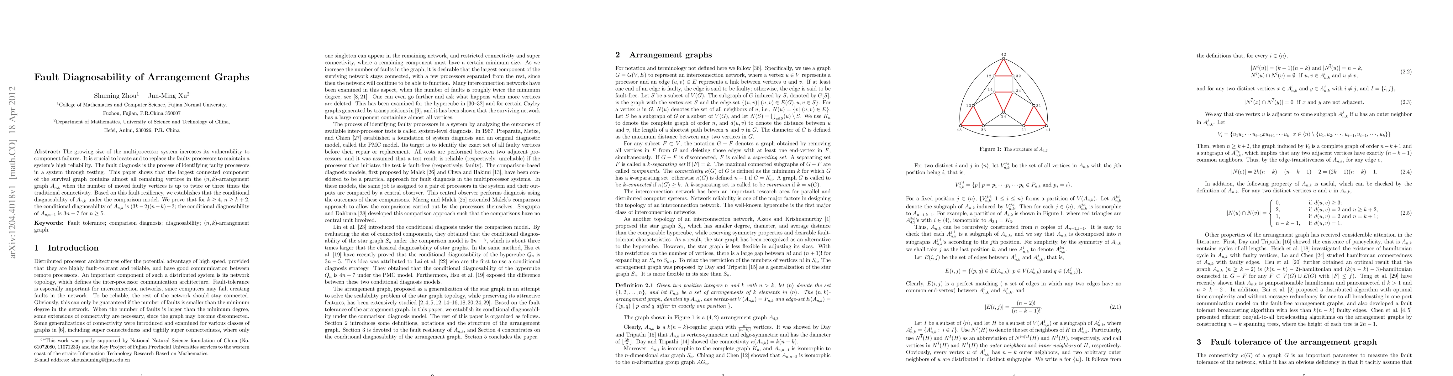 This paper investigates the fault diagnosability of $(n,k)$-arrangement graphs, demonstrating that the largest connected component in the survival graph can contain almost all remaining vertices when faulty processors are up to twice or three times the traditional connectivity. It establishes the conditional diagnosability of $A_{n,k}$ under the comparison model, proving specific values for $k\geq 4$ and $n\geq k+2$.