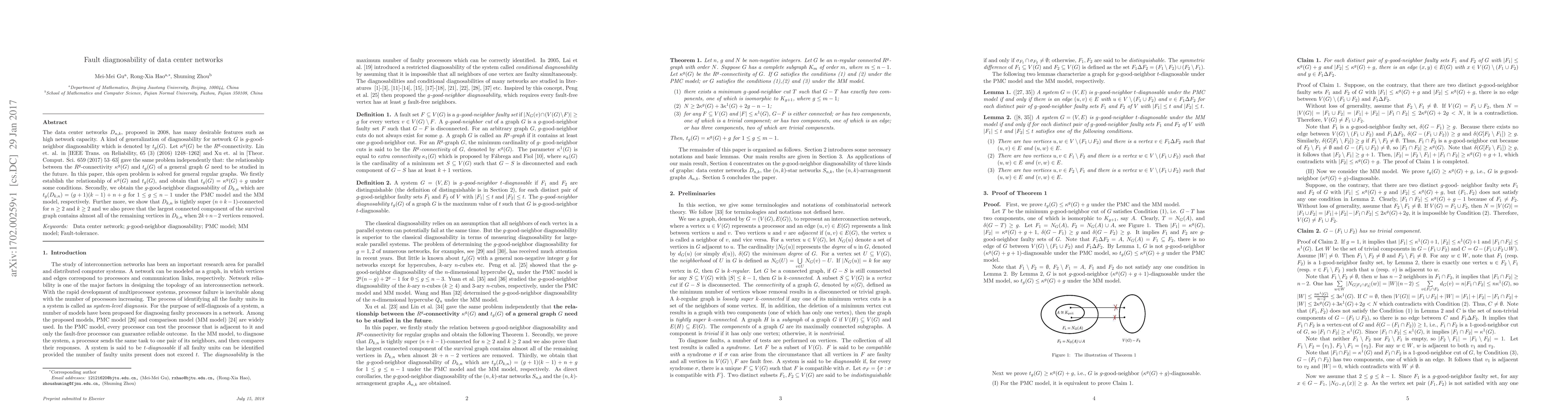 This research paper investigates the fault diagnosability of data center networks, establishing a relationship between network connectivity and diagnosability for regular graphs, and providing results on specific data center network configurations.