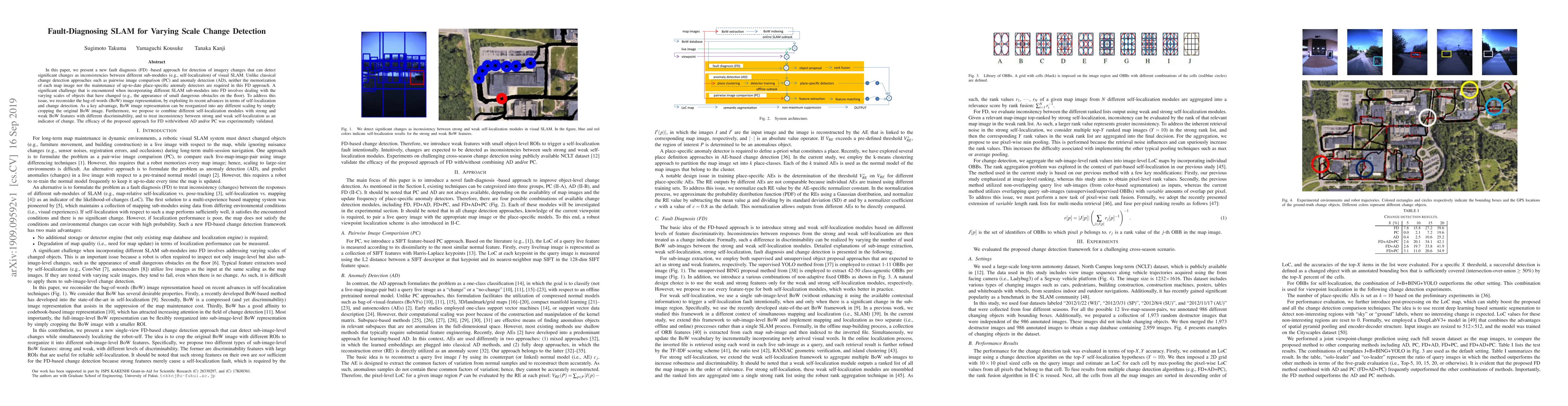 In this paper, we present a new fault diagnosis (FD) -based approach for detection of imagery changes that can detect significant changes as inconsistencies between different sub-modules (e.g., self-localizaiton) of visual SLAM. Unlike classical change detection approaches such as pairwise image comparison (PC) and anomaly detection (AD), neither the memorization of each map image nor the maintenance of up-to-date place-specific anomaly detectors are required in this FD approach. A significant challenge that is encountered when incorporating different SLAM sub-modules into FD involves dealing with the varying scales of objects that have changed (e.g., the appearance of small dangerous obstacles on the floor). To address this issue, we reconsider the bag-of-words (BoW) image representation, by exploiting its recent advances in terms of self-localization and change detection. As a key advantage, BoW image representation can be reorganized into any different scaling by simply cropping the original BoW image. Furthermore, we propose to combine different self-localization modules with strong and weak BoW features with different discriminativity, and to treat inconsistency between strong and weak self-localization as an indicator of change. The efficacy of the proposed approach for FD with/without AD and/or PC was experimentally validated.