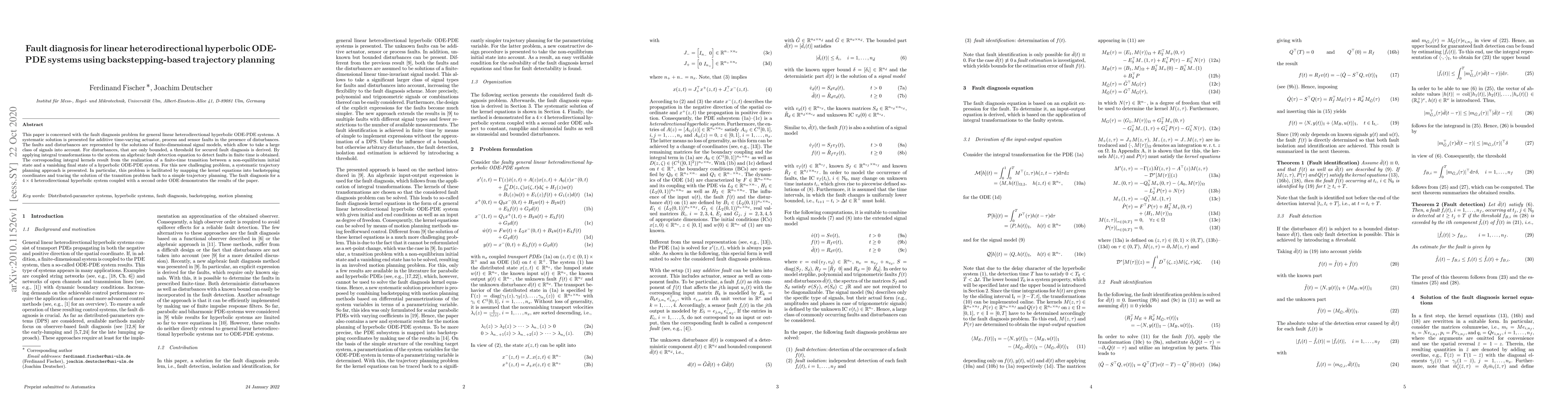 This paper is concerned with the fault diagnosis problem for general linear heterodirectional hyperbolic ODE-PDE systems. A systematic solution is presented for additive time-varying actuator, process and sensor faults in the presence of disturbances. The faults and disturbances are represented by the solutions of finite-dimensional signal models, which allow to take a large class of signals into account. For disturbances, that are only bounded, a threshold for secured fault diagnosis is derived. By applying integral transformations to the system an algebraic fault detection equation to detect faults in finite time is obtained. The corresponding integral kernels result from the realization of a finite-time transition between a non-equilibrium initial state and a vanishing final state of a hyperbolic ODE-PDE system. For this new challenging problem, a systematic trajectory planning approach is presented. In particular, this problem is facilitated by mapping the kernel equations into backstepping coordinates and tracing the solution of the transition problem back to a simple trajectory planning. The fault diagnosis for a $4\times 4$ heterodirectional hyperbolic system coupled with a second order ODE demonstrates the results of the paper.