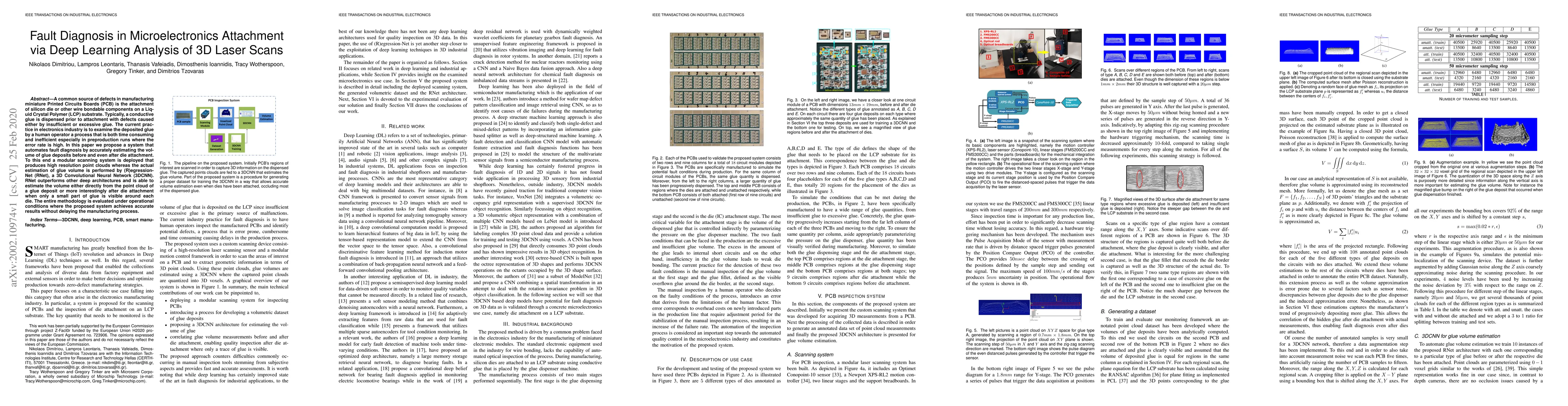A common source of defects in manufacturing miniature Printed Circuits Boards (PCB) is the attachment of silicon die or other wire bondable components on a Liquid Crystal Polymer (LCP) substrate. Typically, a conductive glue is dispensed prior to attachment with defects caused either by insufficient or excessive glue. The current practice in electronics industry is to examine the deposited glue by a human operator a process that is both time consuming and inefficient especially in preproduction runs where the error rate is high. In this paper we propose a system that automates fault diagnosis by accurately estimating the volume of glue deposits before and even after die attachment. To this end a modular scanning system is deployed that produces high resolution point clouds whereas the actual estimation of glue volume is performed by (R)egression-Net (RNet), a 3D Convolutional Neural Network (3DCNN). RNet outperforms other deep architectures and is able to estimate the volume either directly from the point cloud of a glue deposit or more interestingly after die attachment when only a small part of glue is visible around each die. The entire methodology is evaluated under operational conditions where the proposed system achieves accurate results without delaying the manufacturing process.