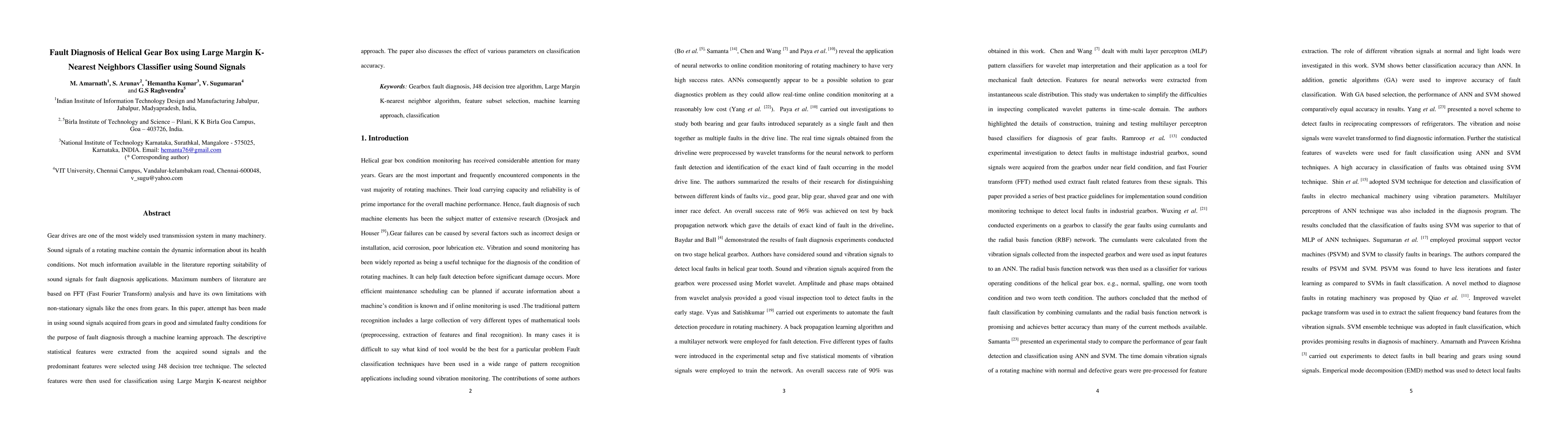 This paper explores fault diagnosis of helical gear boxes using sound signals and a Large Margin K-Nearest Neighbors (LMKNN) classifier. It extracts descriptive features from sound signals and employs a J48 decision tree to select the most relevant features for classification, evaluating the impact of various parameters on accuracy.