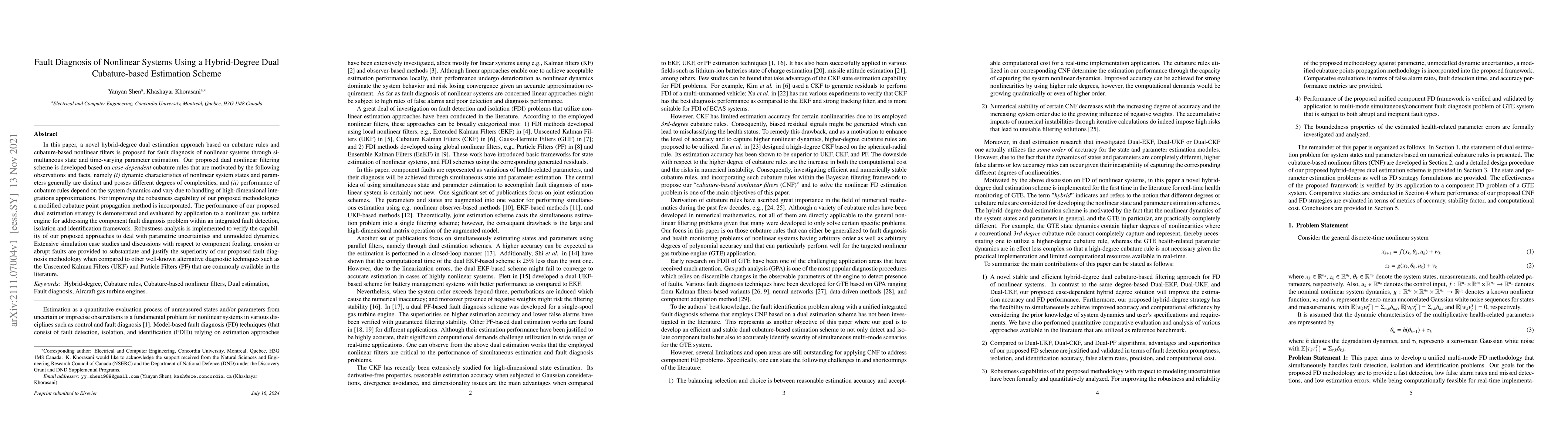 This paper proposes a novel hybrid-degree dual estimation scheme based on cubature rules for fault diagnosis in nonlinear systems, emphasizing simultaneous state and parameter estimation. The method incorporates modified cubature point propagation to enhance robustness and is demonstrated through a gas turbine engine case study, showing superior performance compared to Unscented Kalman Filters and Particle Filters.