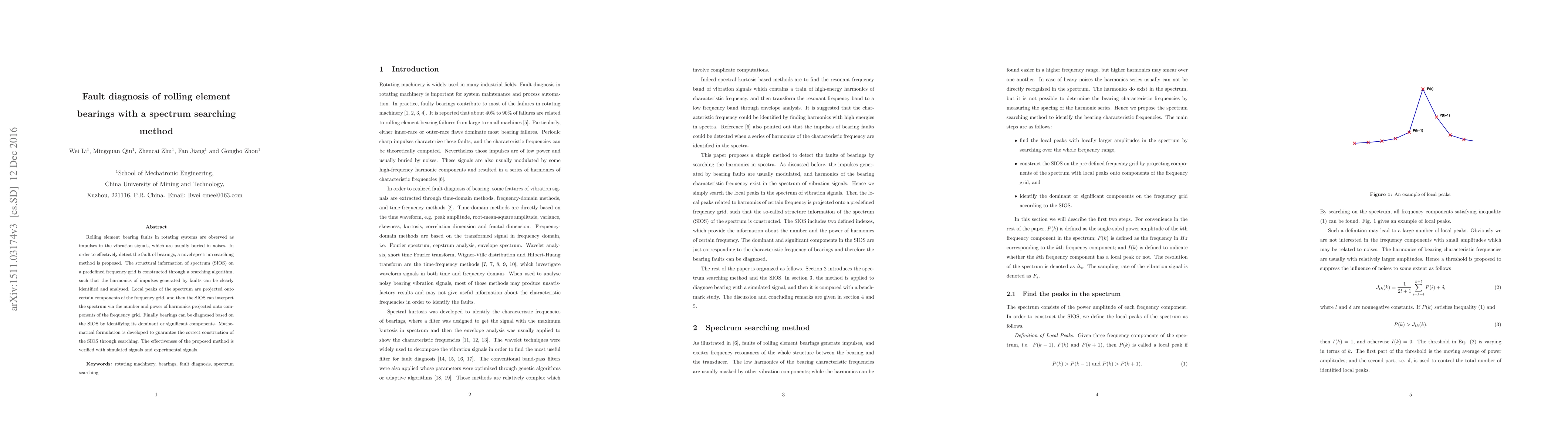 This paper proposes a novel spectrum searching method for diagnosing faults in rolling element bearings by constructing structural information of spectrum (SIOS) to identify and analyze harmonics of fault-generated impulses. The method's effectiveness is validated through simulations and a benchmark study.