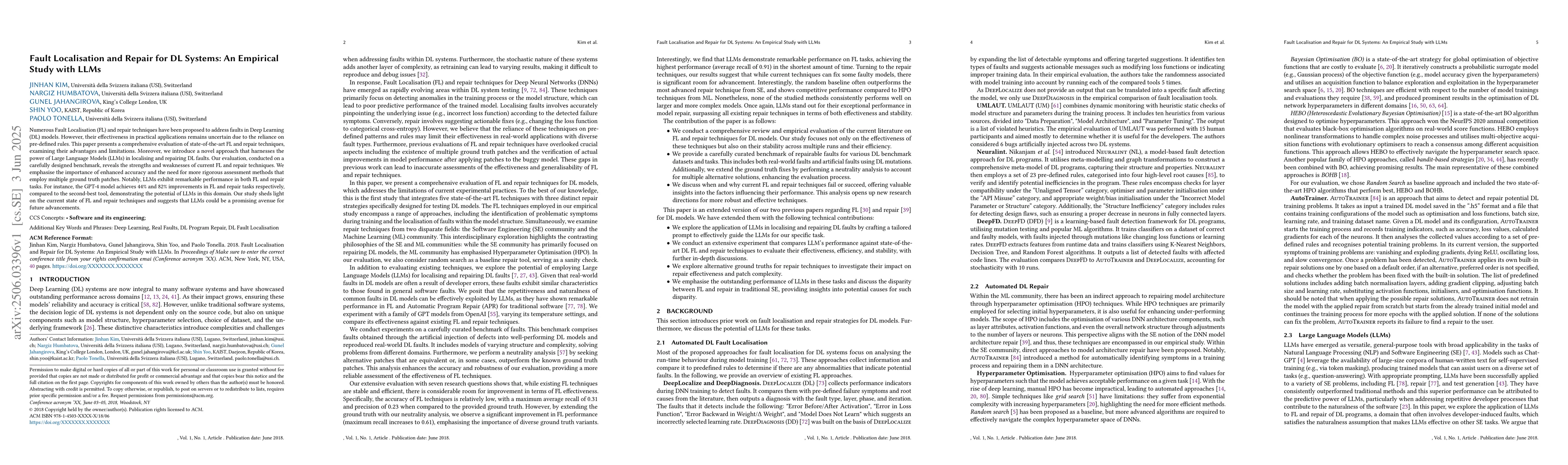 The paper presents a comprehensive evaluation of state-of-the-art Fault Localisation (FL) and repair techniques using a carefully designed benchmark, comparing their performance and introducing a novel approach that leverages Large Language Models (LLMs) for DL fault localisation and repair.